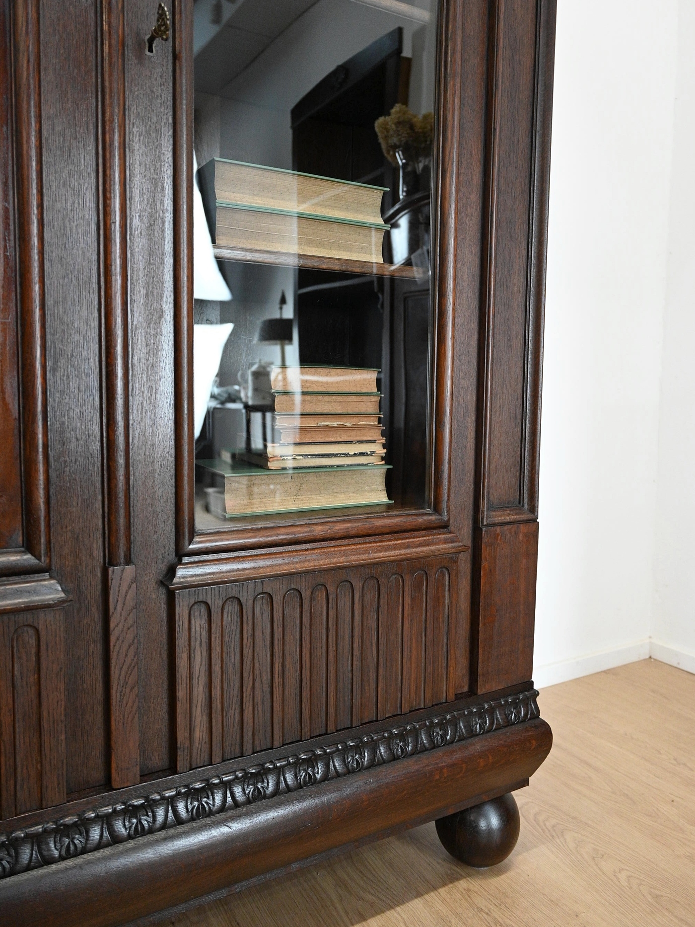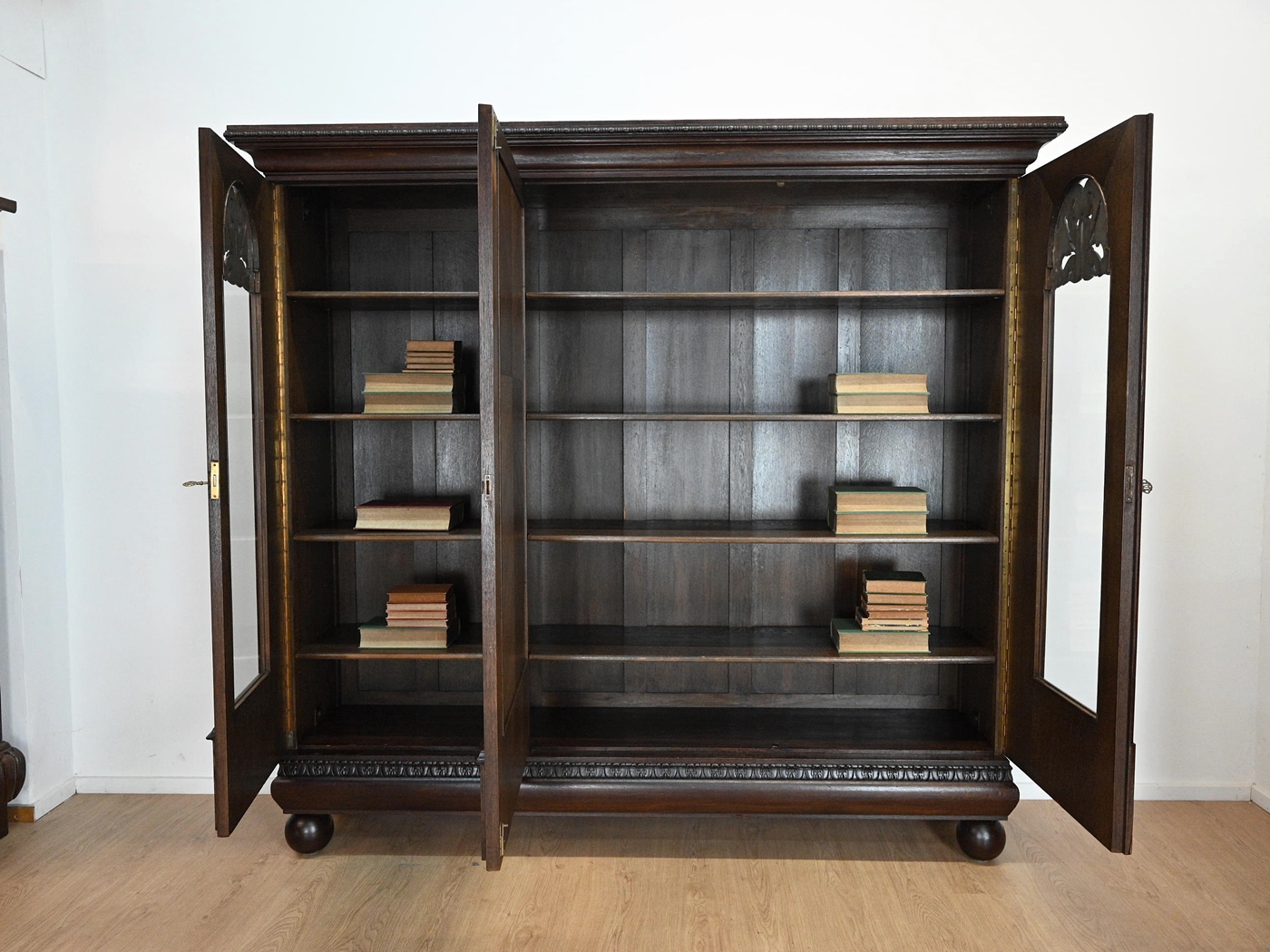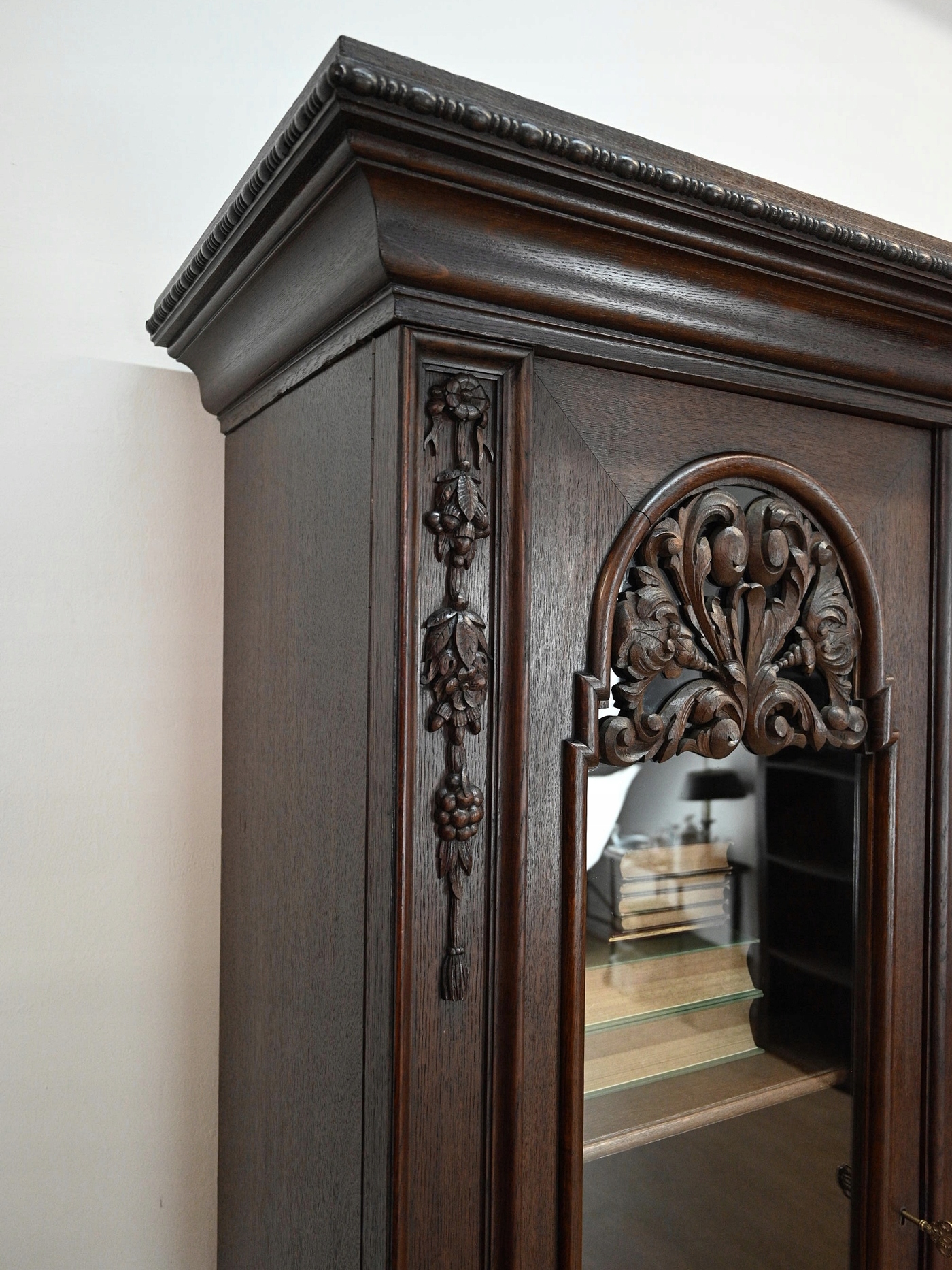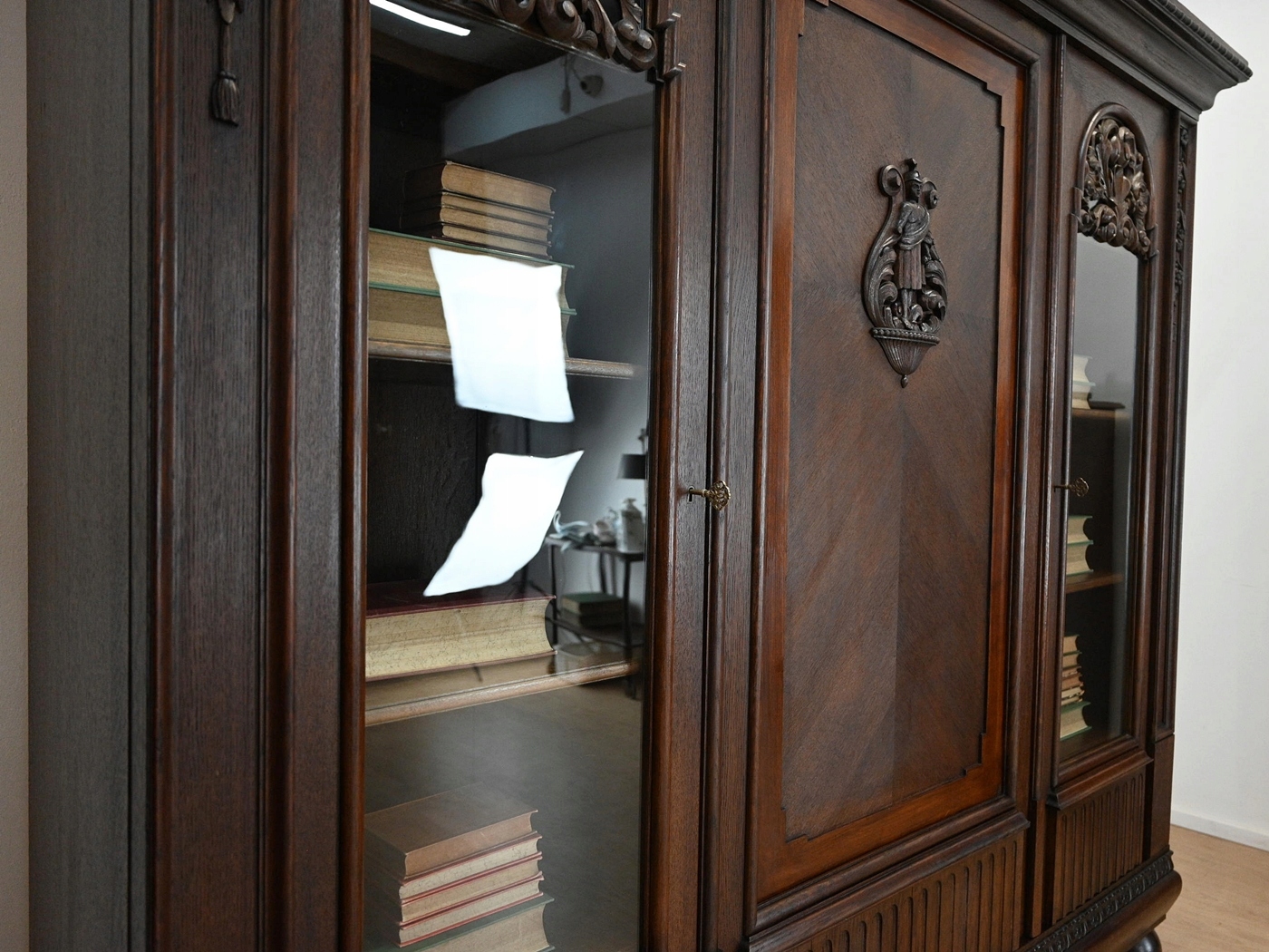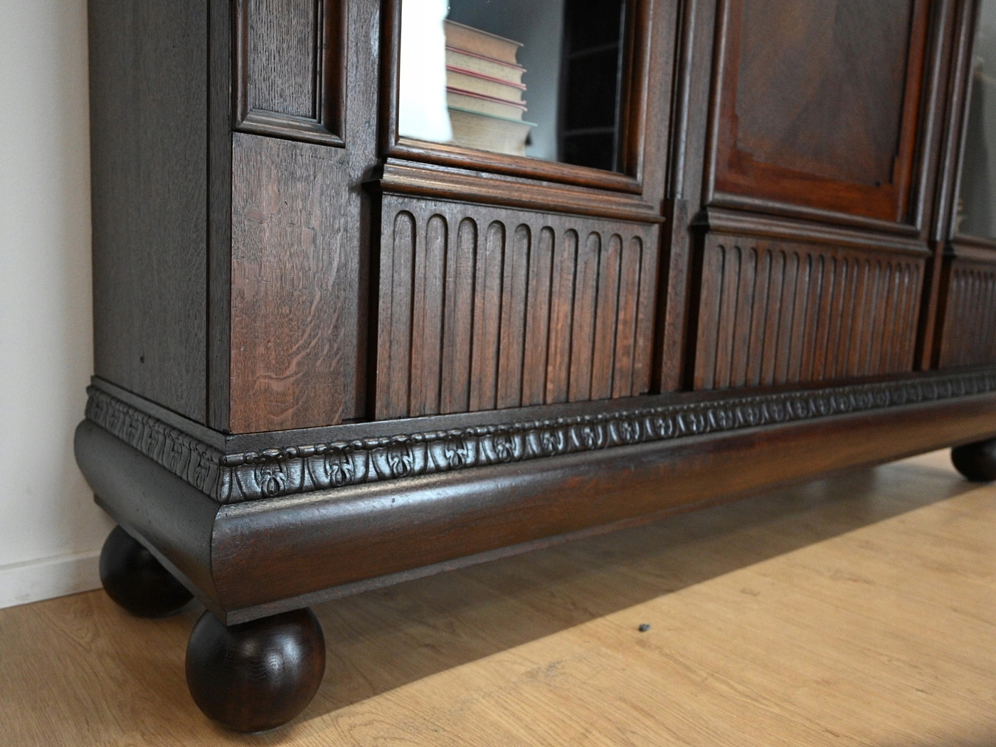 Дуже хороший стан. Меблі, підготовлені до використання. Зовнішні поверхні та центр меблів були оновлені. Меблі вже мають свої роки та сліди минулого часу, що не впливає на його естетичний прийом, вони є свідченням справжності меблів. Бібліотеку можна відразу поставити в квартиру.