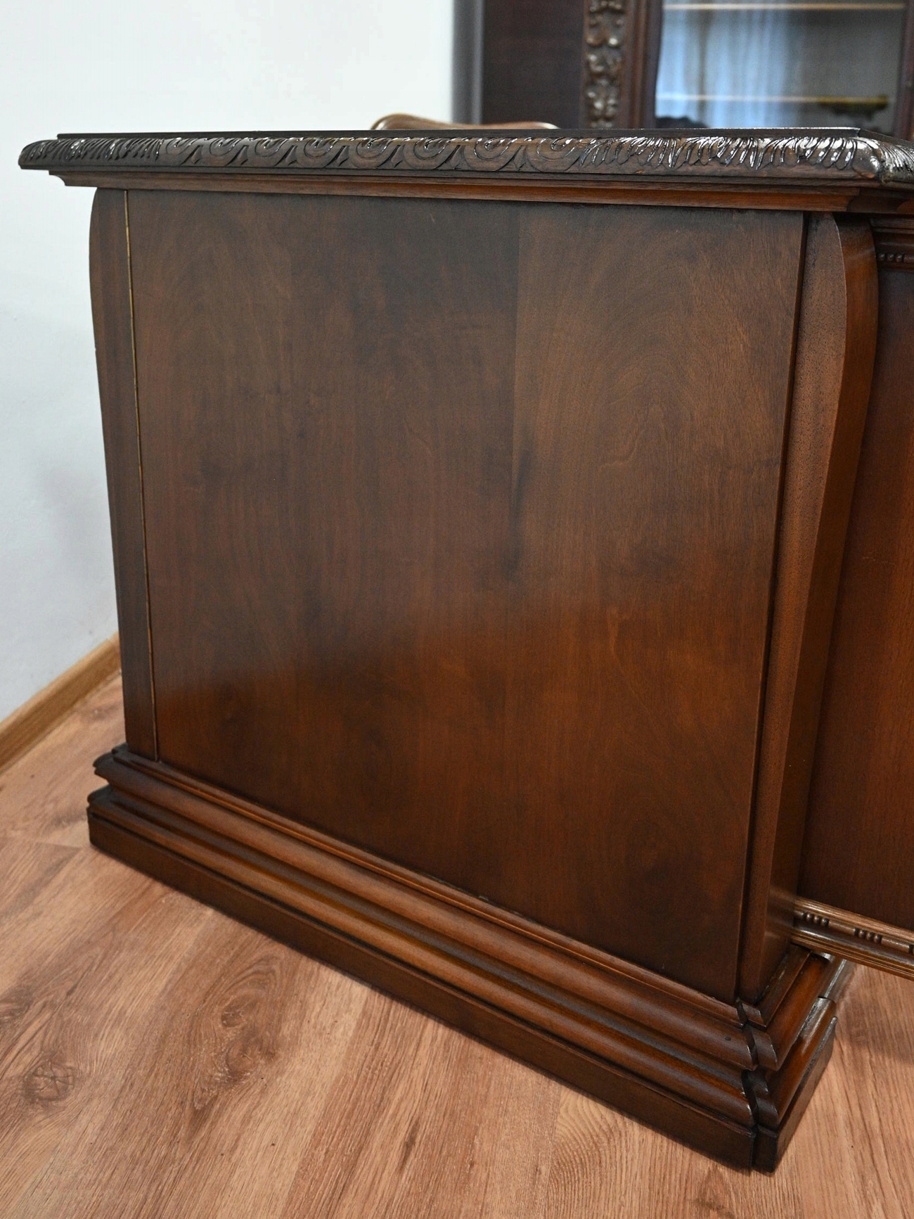 Він повністю виготовлений з деревини, облицьований горіховим шпоном.