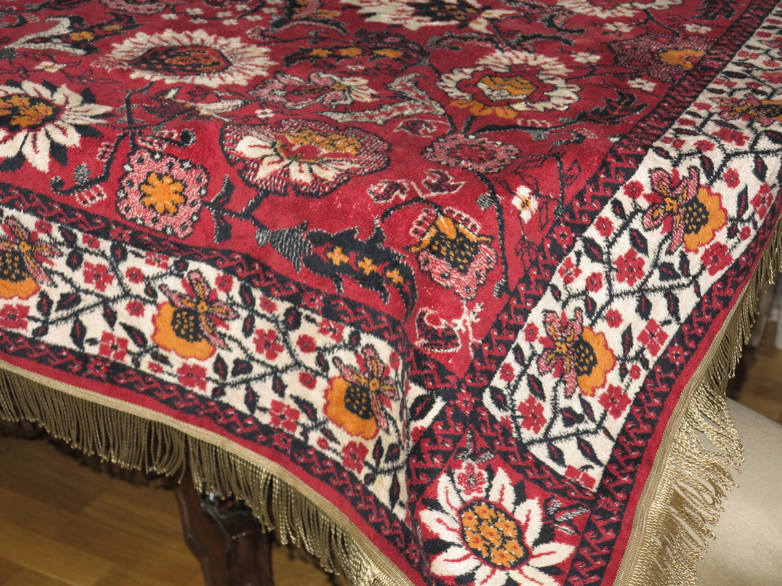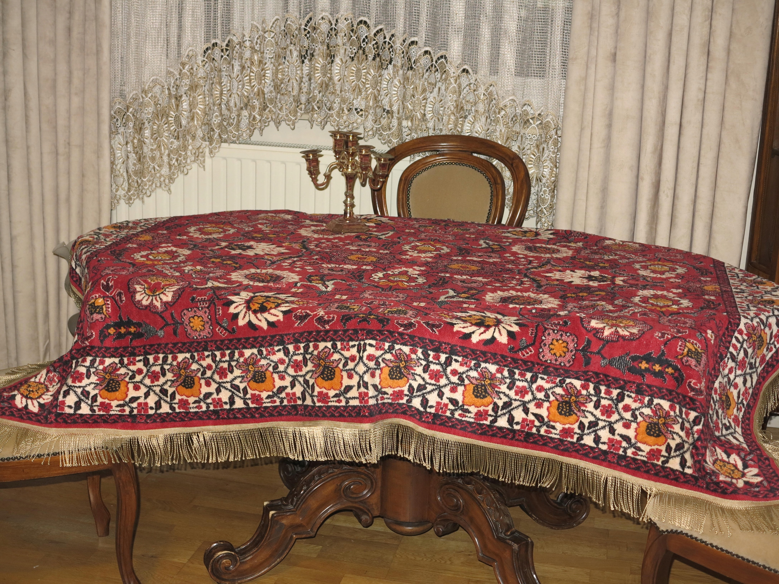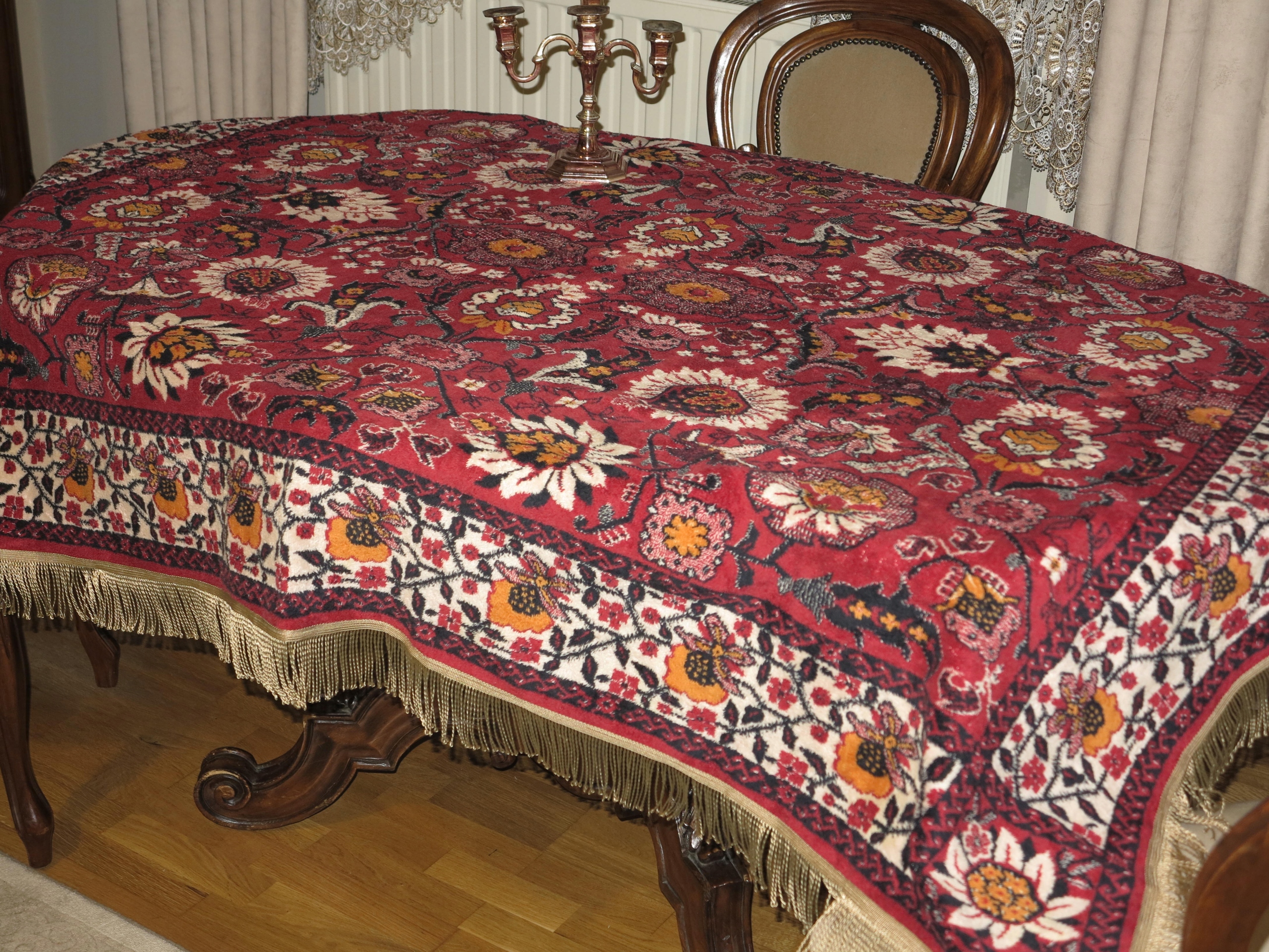 -a красива стильна старовинна скатертина, мотлох, виготовлений з благородного, товстого бавовняного акаміт. Про золоті бахроми. Домінуючий колір- Бургундський