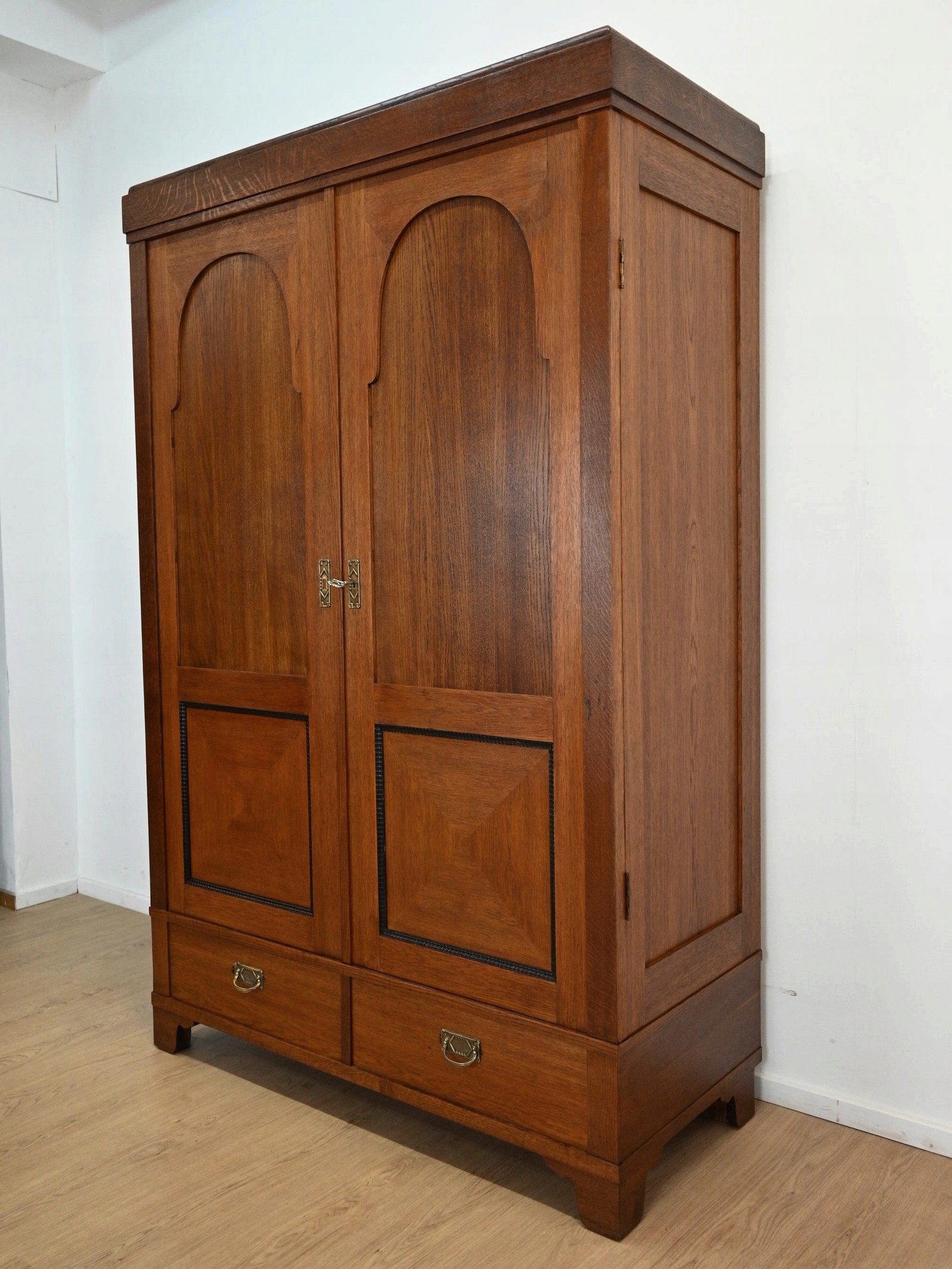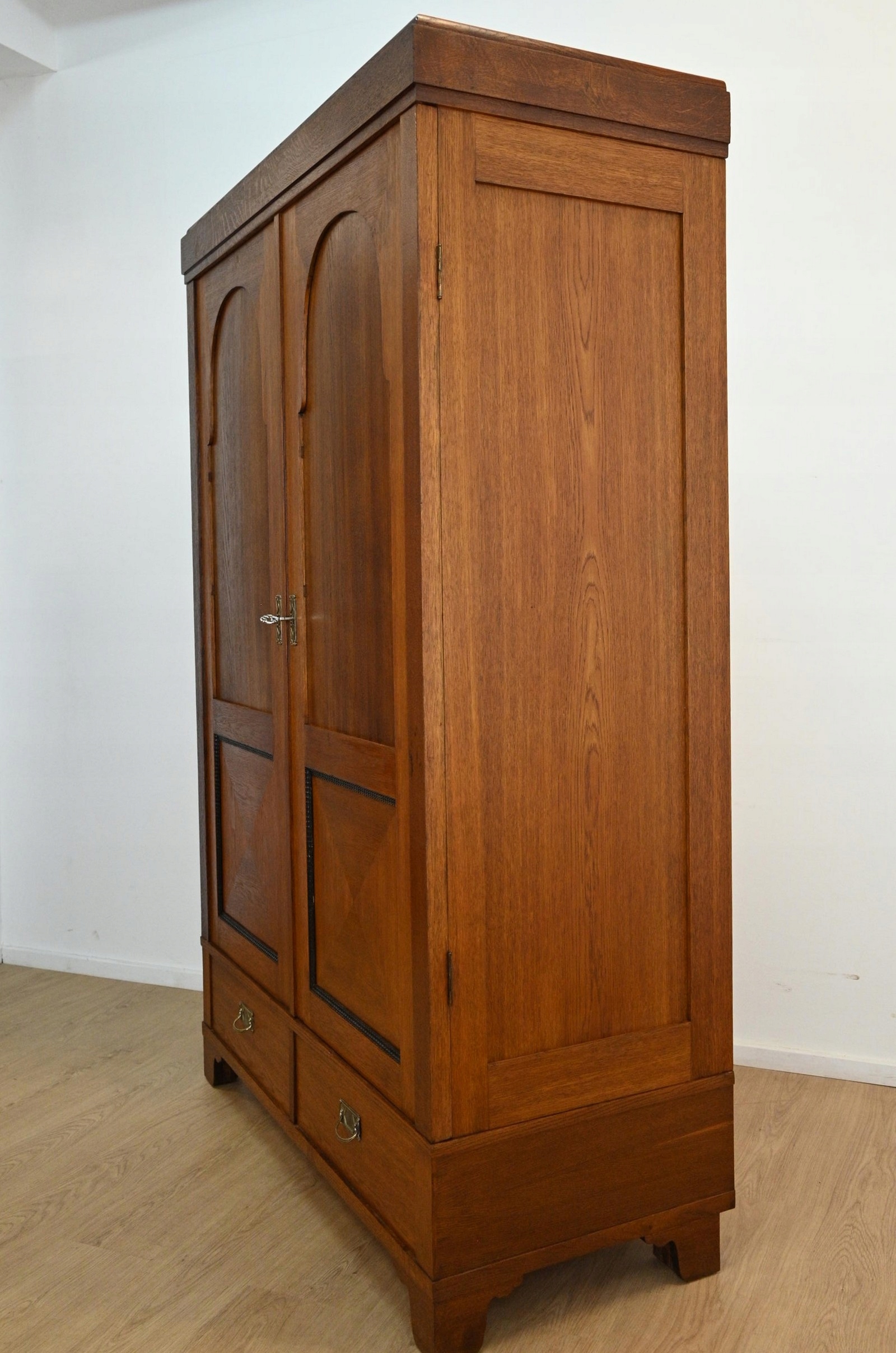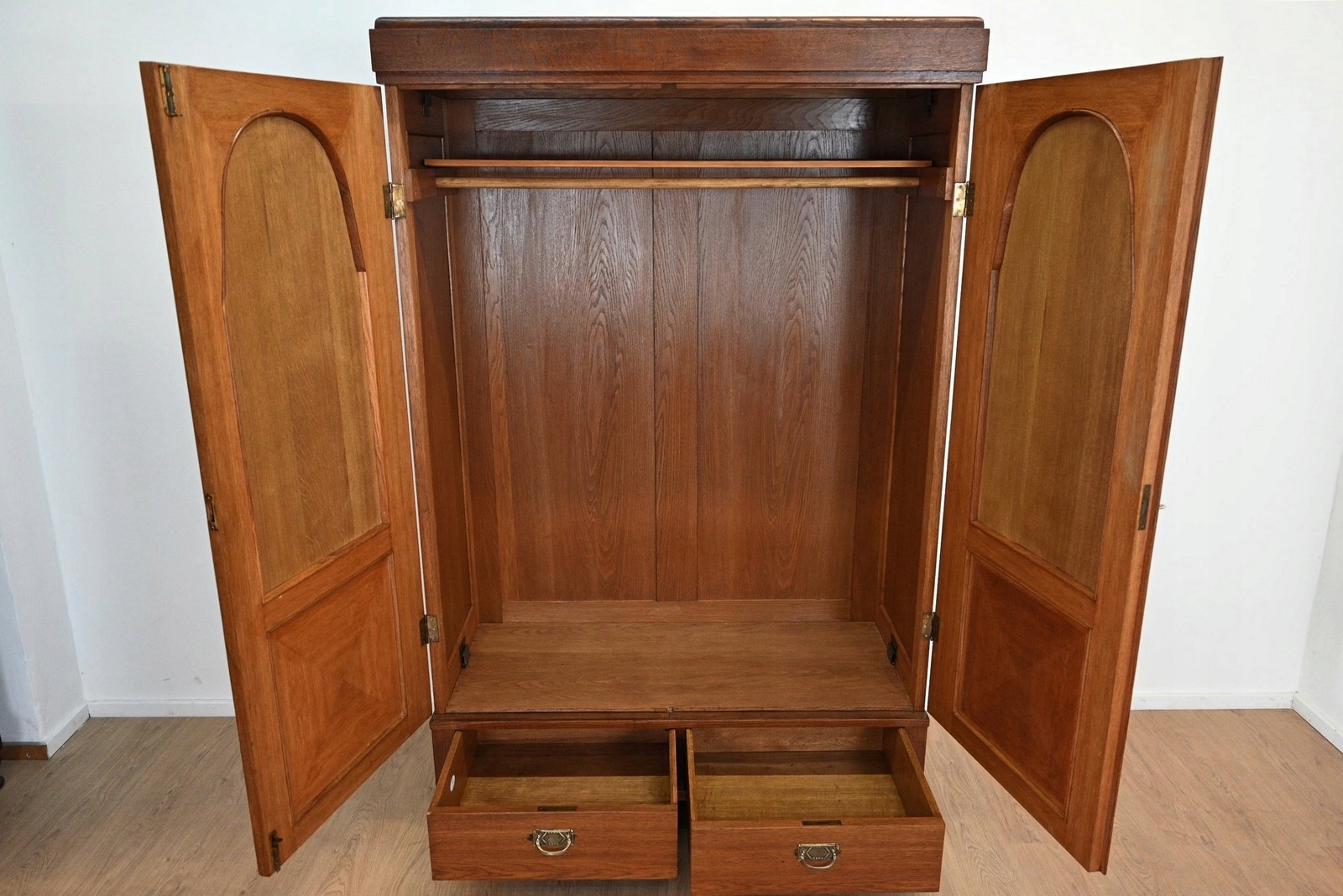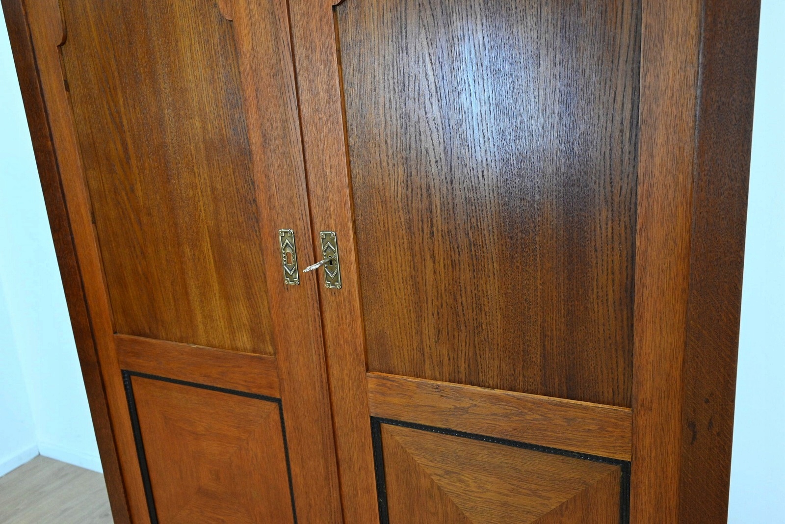 Дуже хороший стан. Меблі, підготовлені до використання. Зовнішні поверхні та центр меблів були оновлені. Меблі вже мають свої роки та сліди минулого часу, що не впливає на його естетичний прийом, вони є свідченням справжності меблів. Гардероб можна відразу помістити в квартиру.