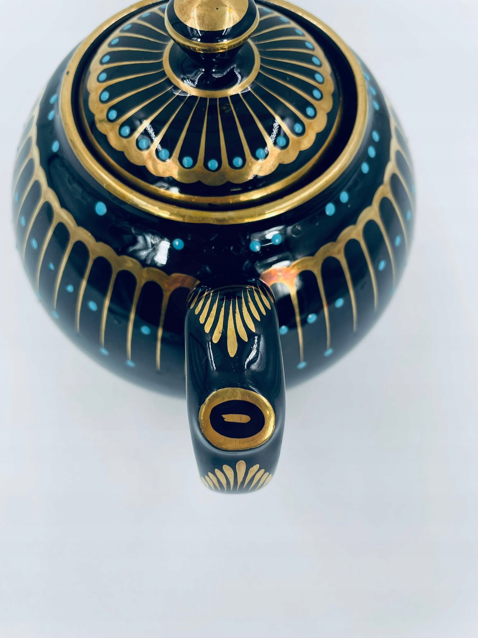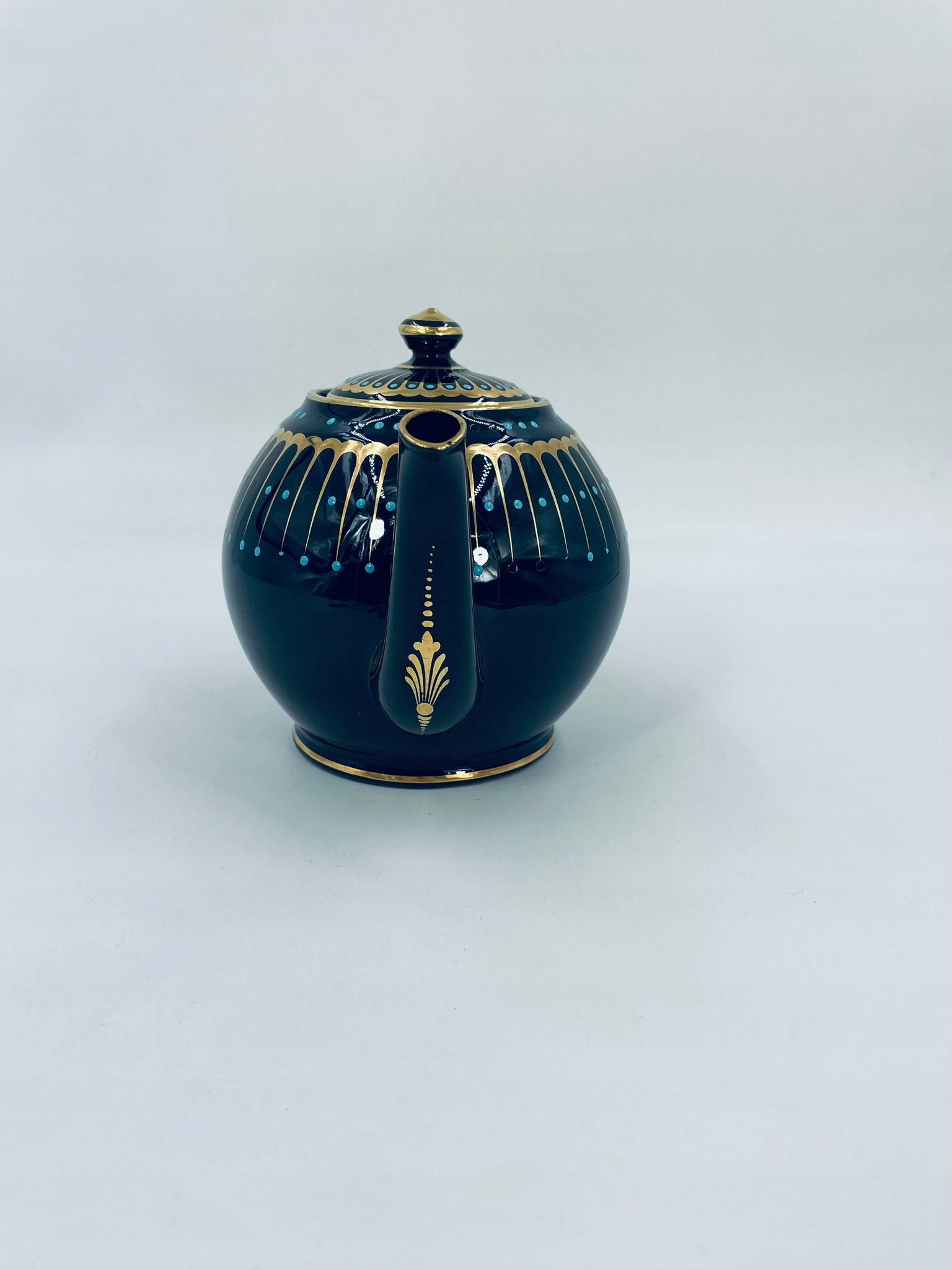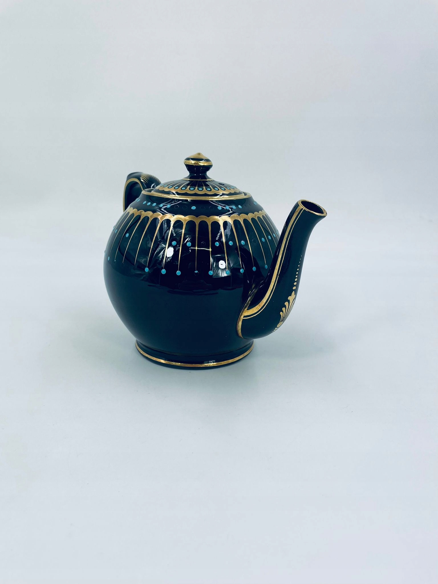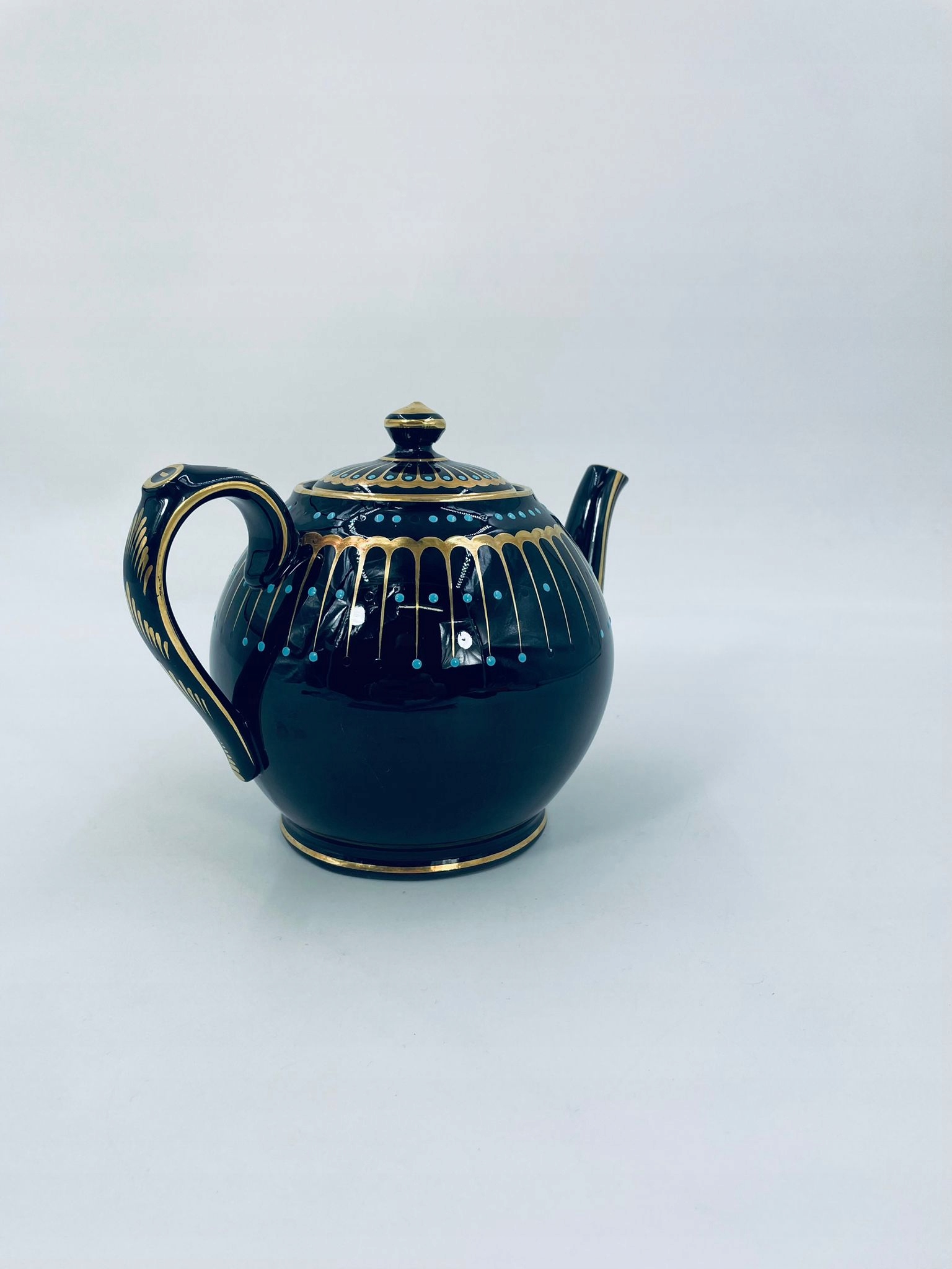 Античний глечик для чаю від Sadler, виготовлений із високоякісної англійської чорної кераміки. Чайник характеризується багатим золотим декором і акцентами з бірюзових точок. Має сколи на бірюзових крапках.