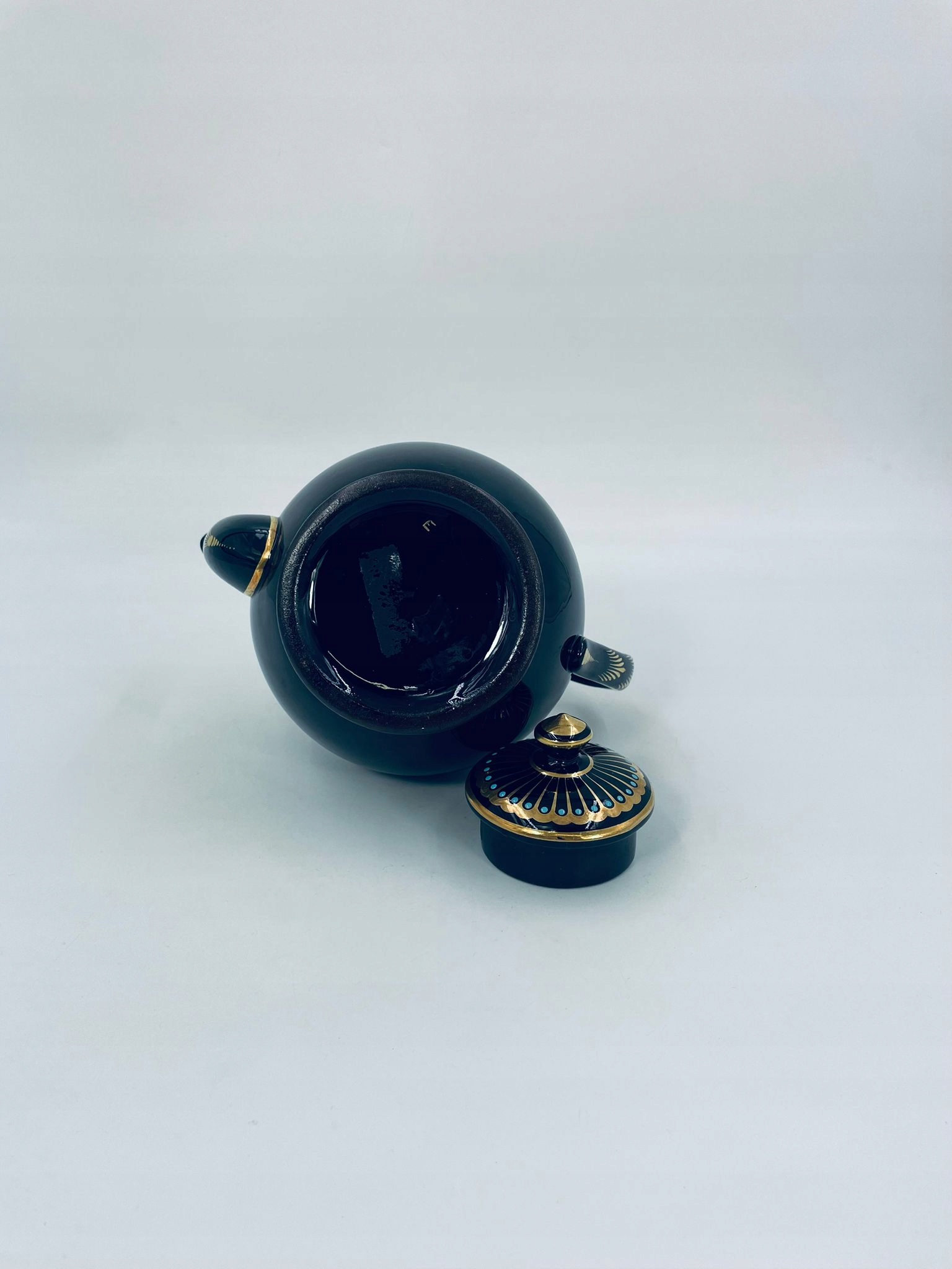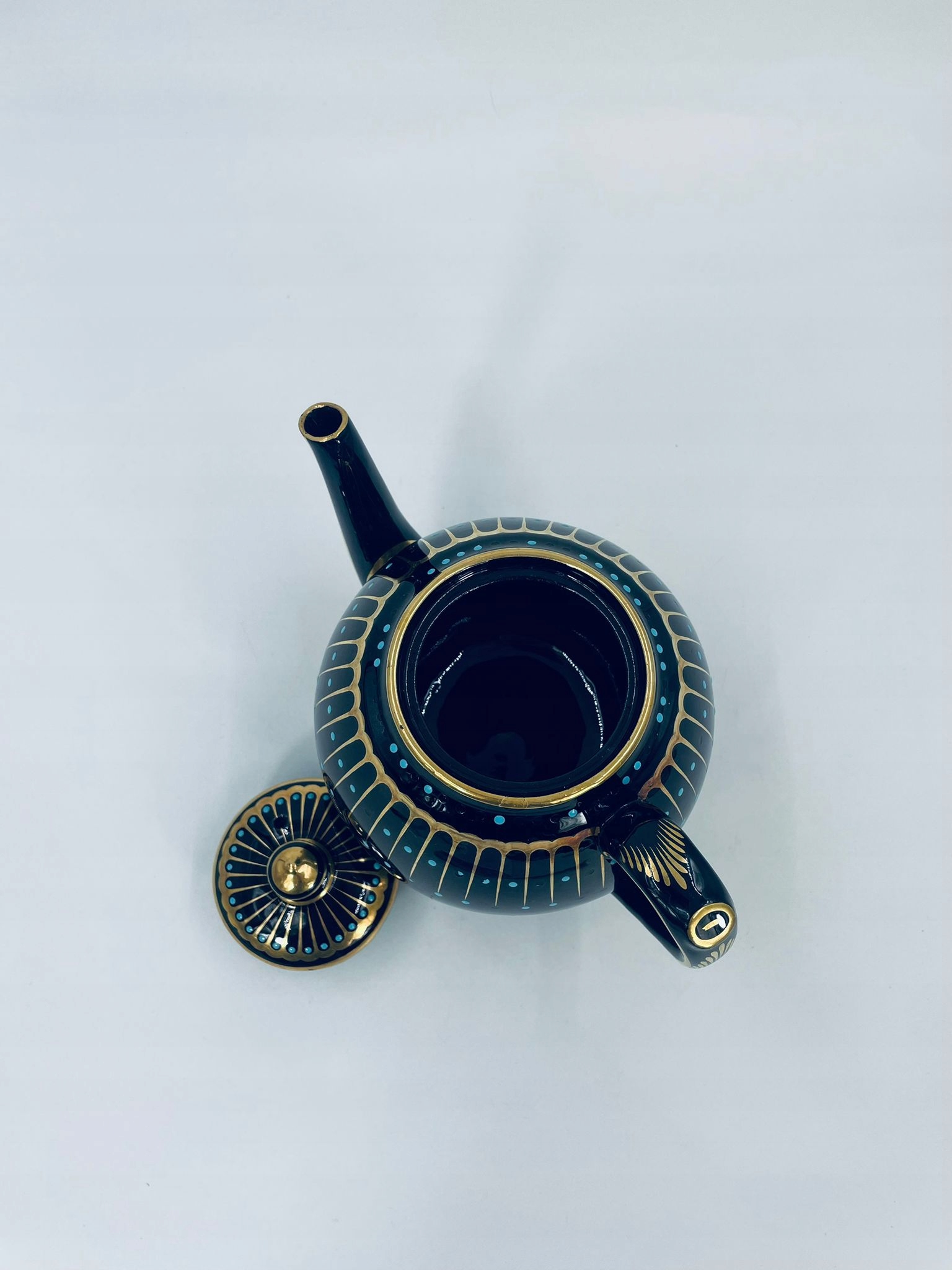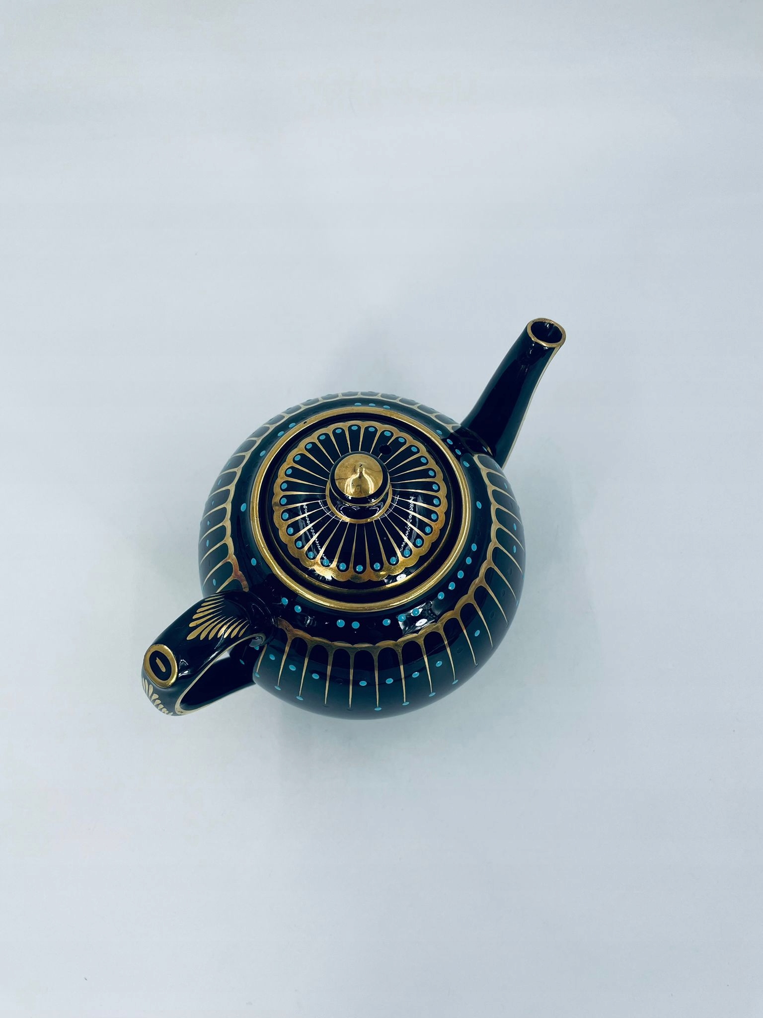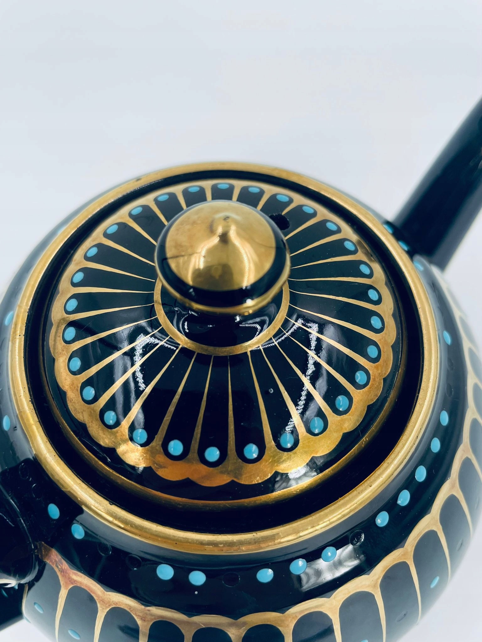 Античний глечик для чаю від Sadler, виготовлений із високоякісної англійської чорної кераміки. Чайник характеризується багатим золотим декором і акцентами з бірюзових точок. Має сколи на бірюзових крапках.