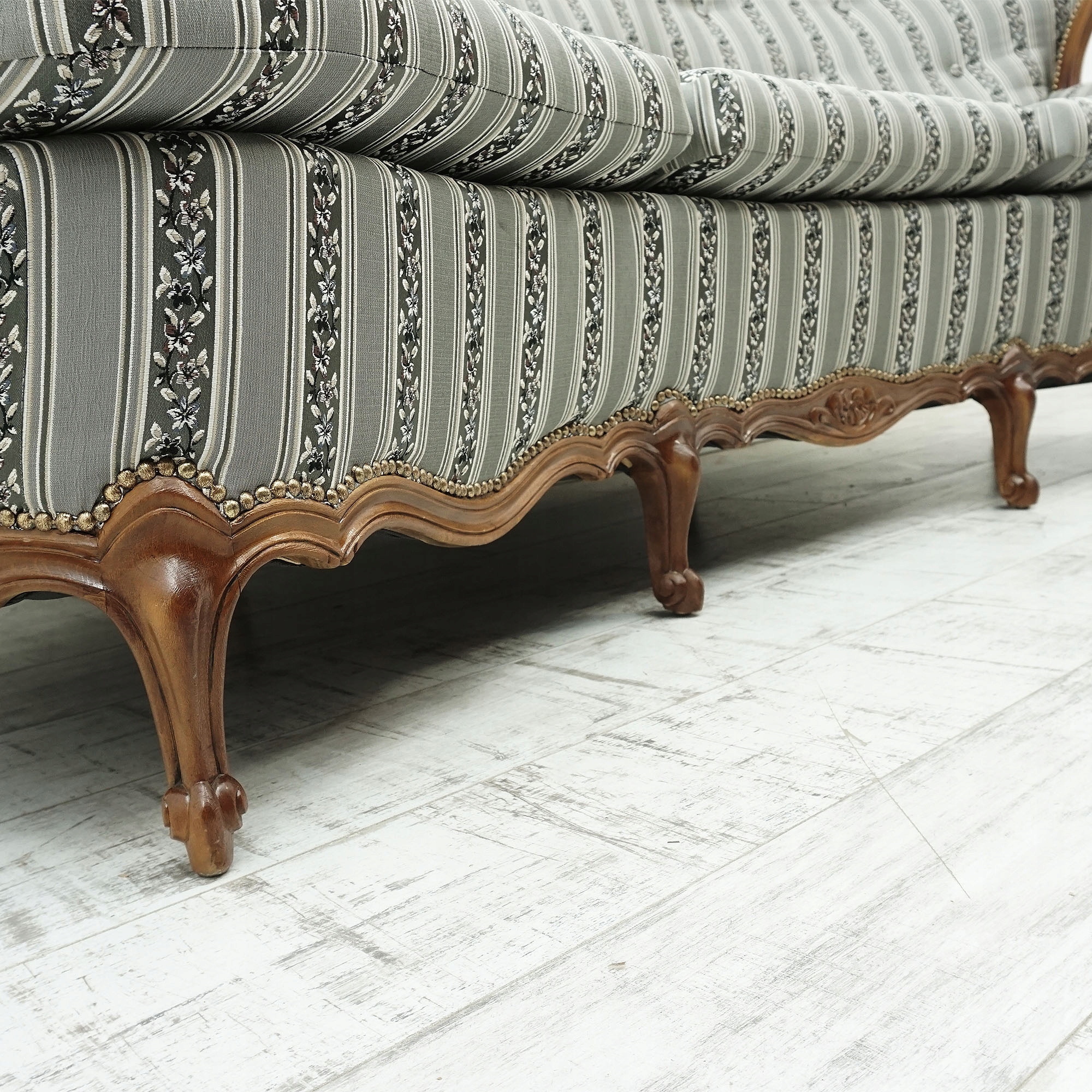 Ось елегантний салонний набір, який поєднує класичний стиль з винятковим комфортом. Цей смачний набір складається з дивана, двох сидінь та міцного дерев’яного столу. Багатий оформлені дерев’яні рамки, що визначають руки, дають йому розкішний характер, а оббивка з смужками в відтінках сірого та бежевого кольору додає інтер’єру класичну елегантність.