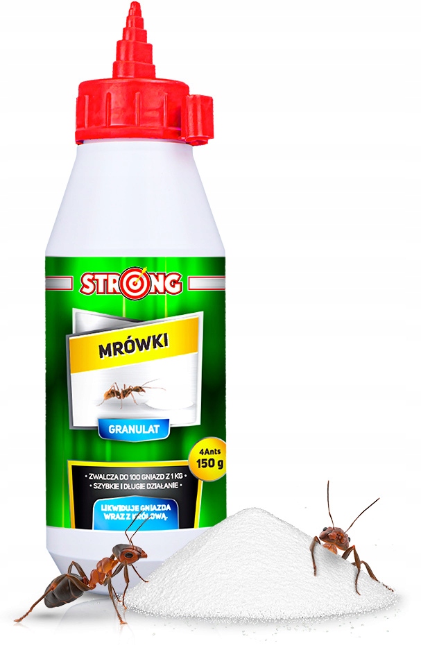 Сильний для мурашок - це ефективна інсектицидна підготовка до боротьби з різними видами мурашок, таких як звичайна оптова, звичайна коробка або фараон Mrówka. Гранули готові до миттєвого використання і використовуються для посипання доріжок, по яких рухаються мурахи. Агент для мурашок може бути розкиданий навколо квітів та фруктових чагарників , що може допомогти захистити рослини. Cypermemetryna, що міститься в гранулаті, є активною речовиною, яка має шлунок та контакт, що призводить до паралічу і внаслідок смерті.