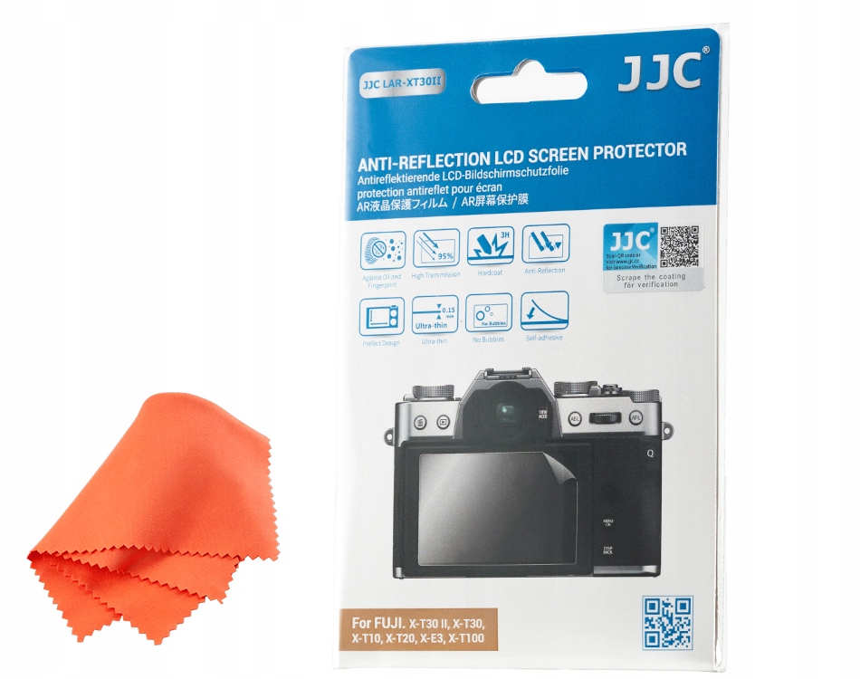 протирефлективна кришка JJC LAR-XT30II, призначена для головного РК-екрана в Fujifilm X-T30 II, X-T30, X-T10, X-T20, X-E3, X-T100, X-T50. Обкладинка відрізняється покриттям з низьким вмістомбласоном, яке зменшує небажані відбиття світла з екрана, зберігаючи аж 95% проникності світла. Обкладинка стійка до випадкових подряпин, вона також має спеціальне покриття, що мінімізує утворення відбитків пальців, смуг і жирних плям. Пакет містить кришку та необхідні прибирання аксесуарів (зволожена тканина, суха тканина та шматочок пилу). Особливості ключових особливостей: