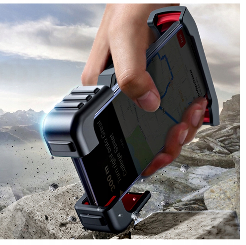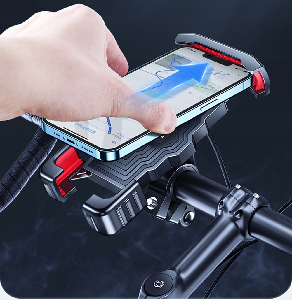 4.Швидке зняття замка. Нахиліть мобільний телефон, щоб натиснути на верхню частину, велосипедний тримач для телефону автоматично щільно захопить телефон. Коли ви натискаєте на верхню частину, вона знову відпускає її. Все однією рукою.