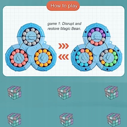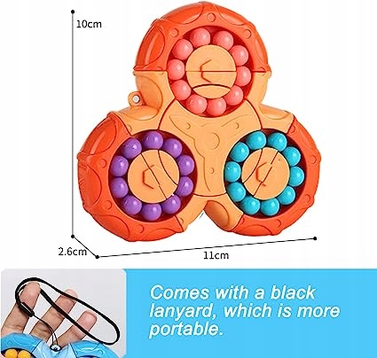 Обертовий куб з магічними намистинами двосторонній і складається з 6 різних кольорів і 60 чарівних намистин. Він розділений на 3 кола, з яких можна обертати кінчик, і кожна намистина міцно врізається в нього і нелегко випасти. Повертаючи середнє коло, можна з'єднати між собою 3 кола бісеру. Ви можете вільно переміщати намистинки обома руками та надавати їм різні кольори.