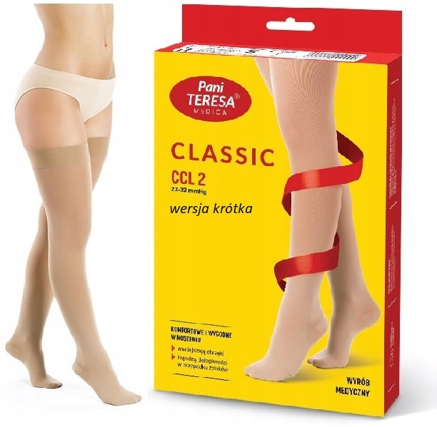 Компресійні продукти Pass Teresa Medica Classic є це медичні пристрої, що використовуються в компресійній терапії. Продукти призначені для лікування варикозного розширення вен і набряків. В упаковці 2 шт. панчох. Ними можуть користуватися як жінки, так і чоловіки. Самонесуча манжета зсередини оброблена силіконом.