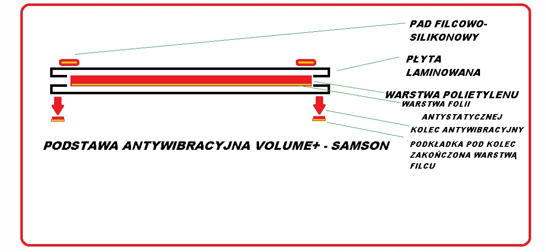 Сандвіч-платформа - шар поліетилену товщиною 10 мм поміщений між двома шарами дощок 18 мм. Цей матеріал, завдяки своїй гнучкості та поглинанню, дуже добре поглинає всі вібрації. Цей матеріал менше платформи. Виглядає добре. Крім того, під поліетиленом розміщено шар антистатичної фольги, щоб мінімізувати електростатичні перешкоди, які також мінімально впливають на аудіообладнання.