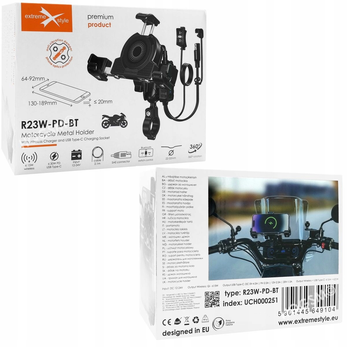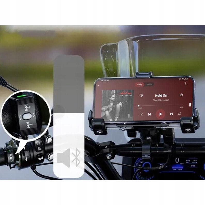 Комплексне рішення для мотоцикла - тримач, бездротовий зарядний пристрій, роз'єм USB-C і пульт дистанційного керування Bluetooth для керування телефоном. Комфорт і безпека в одному.