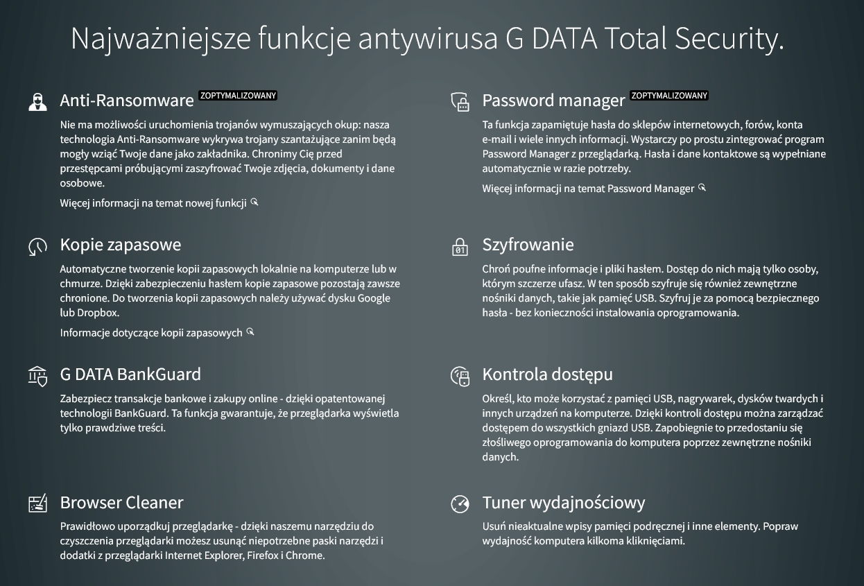 Це ніколи не було так просто оплатити рахунки або зробити покупку. Ваше рішення щодо безпеки може бути таким же простим, як покупки в Інтернеті. Виберіть швидку установку програмного забезпечення та простоту використання. G Загальна безпека даних забезпечує найкращий захист інтернет-банкінгу, електронних листів та критичних даних. Потужний антивірусний сканер та численні додавання захищають вас від крадіжок, примусових та кібер -атак -без порушення роботи та відпочинку. Програмне забезпечення з такими іменами, як Locky та Petya для багатьох користувачів комп'ютера, викликає страх. Кіберзлочинці грають побоювання, що ваші фотографії, відео та спогади назавжди зникнуть. Зловмисне програмне забезпечення шифрує дані на вашому комп’ютері та загрожує розшифрувати лише після оплати викупу. Покладіть кінець вимагання на комп’ютер. Завдяки загальній безпеці даних, ви отримуєте захист від Ransomware, який зупиняє вимагання викупу троянами. Ми вдосконалили наш повний пакет завдяки програмі Manager Password Password. Просто додайте його до браузера як плагін. З цього моменту вам потрібен лише ключ до безпечного пароля. Нова функція пам’ятає всі дані про доступ до інтернет-магазинів, форумів та облікових записів електронної пошти. Це означає, що ви можете працювати з зашифрованими, і, таким чином, надзвичайно безпечними гаслами без необхідності їх пам’ятати. Все, що вам потрібно, - це клацання, щоб диспетчер паролів заповнив паролі та контактні дані, збереження цінного часу. Захистіть себе від втрати даних - легко та ефективно. G Дані Загальна безпека зберігає дані, захищені паролем - локально на комп’ютері або в безпечній хмарі. Використовуйте Google або Dropbox. Все без додаткової установки. Забезпечте те, що близьке до вашого серця. Фотографії та документи також безпечні у випадку з шантажом або хакерською атаку - вони захищені в безпечному місці. 2 ГБ оперативної пам’яті