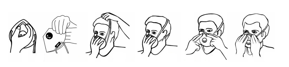 - Обережно помістіть маску на обличчя, закриваючи область рота та носа. Розгорніть маску так, щоб вона щільно прилягала до обличчя (важливо, щоб між обличчям і маскою не було щілин)