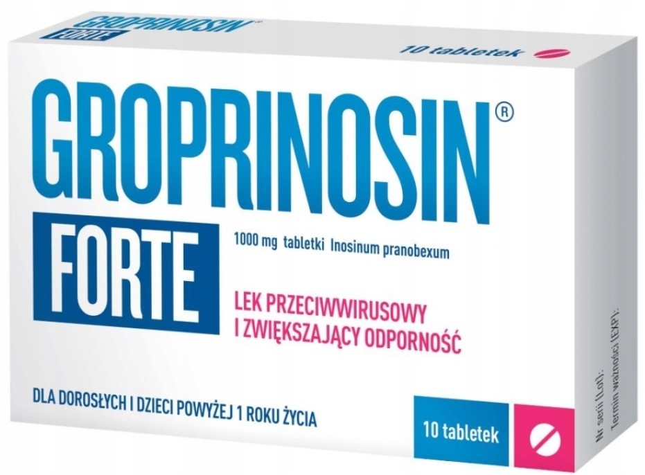 для чого таке groprinosin forte? Індикація для вживання препарату - це зменшення імунітету та рецидивуючих інфекцій верхніх дихальних шляхів. Препарат може бути використаний для боротьби з герпесом губ і шкіри обличчя, що викликається інфекцією простого герпесу, доки в минулому пацієнту вже діагностували інфекцію цим вірусом. Активною речовиною препарату є INOSIN PRANOBEX, який має противірусну. Ця речовина гальмує множення вірусів герпесу. Функція Groprinosin Forte також має підвищити опір організму.