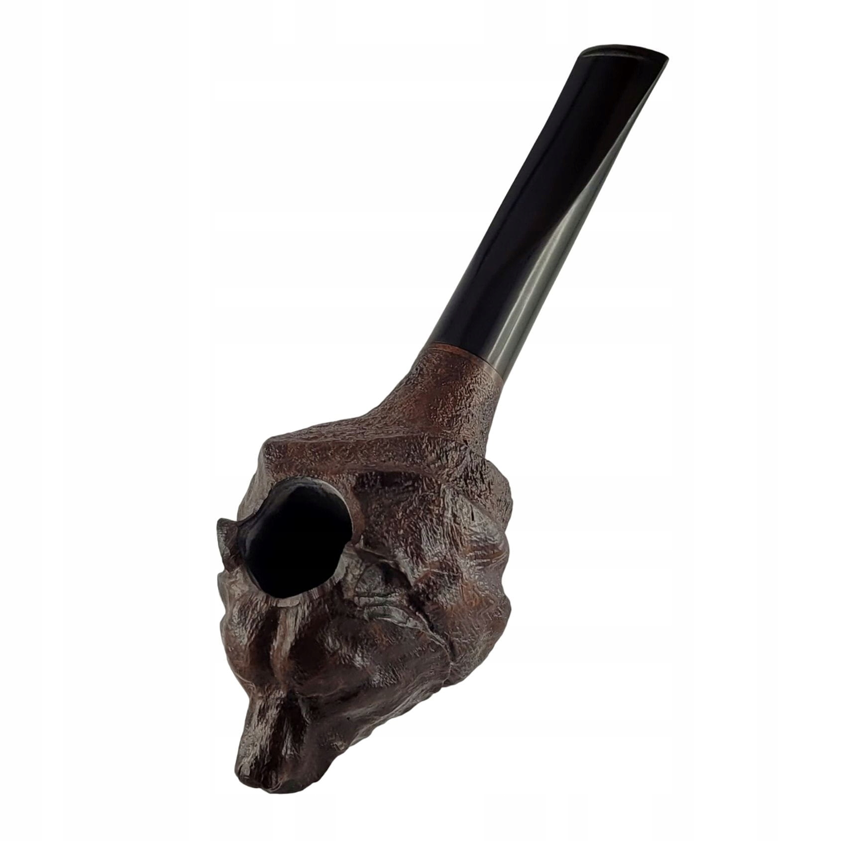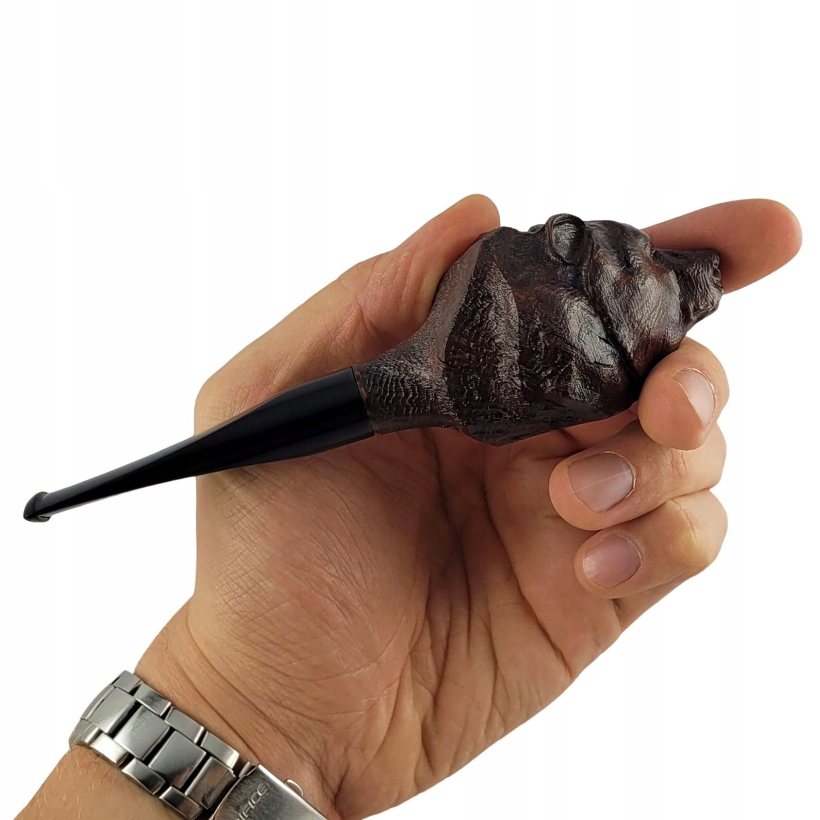Тютюнова люлька фігурна з італійського шипшини з темною плямою. Реалістично різьблена бріарна трубка у формі голови ведмедя випромінює природну елегантність, здатна вловити деталі хутра та витончені обриси м’язів, створюючи унікальний витвір мистецтва з дерева. Поверхня шипшини захищена шаром твердого карнаубського воску та піддана піскоструминній обробці для отримання відповідного зовнішнього вигляду. Мундштук виготовлений з міцного акрилу, має місце для змінного фільтра 9 мм, а також попередньо навуглену топку. Люлька легка і зручна, упакована в тканинний чохол і елегантну подарункову коробку.