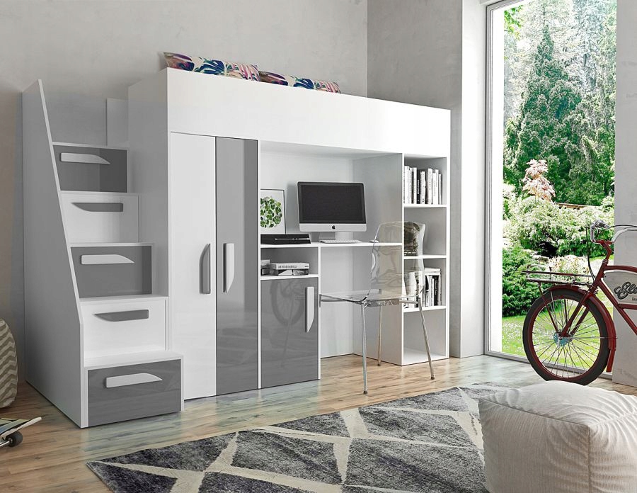 Ліжко-антресолі КАМАце сучасна та функціональна пропозиція для дитячої кімнати. Завдяки своєму дизайну воно дозволяє економити багато місця в кімнаті вашої дитини; має функціональний стіл з полицями та шафа. Бортик ліжка можна вибрати при складанні.
