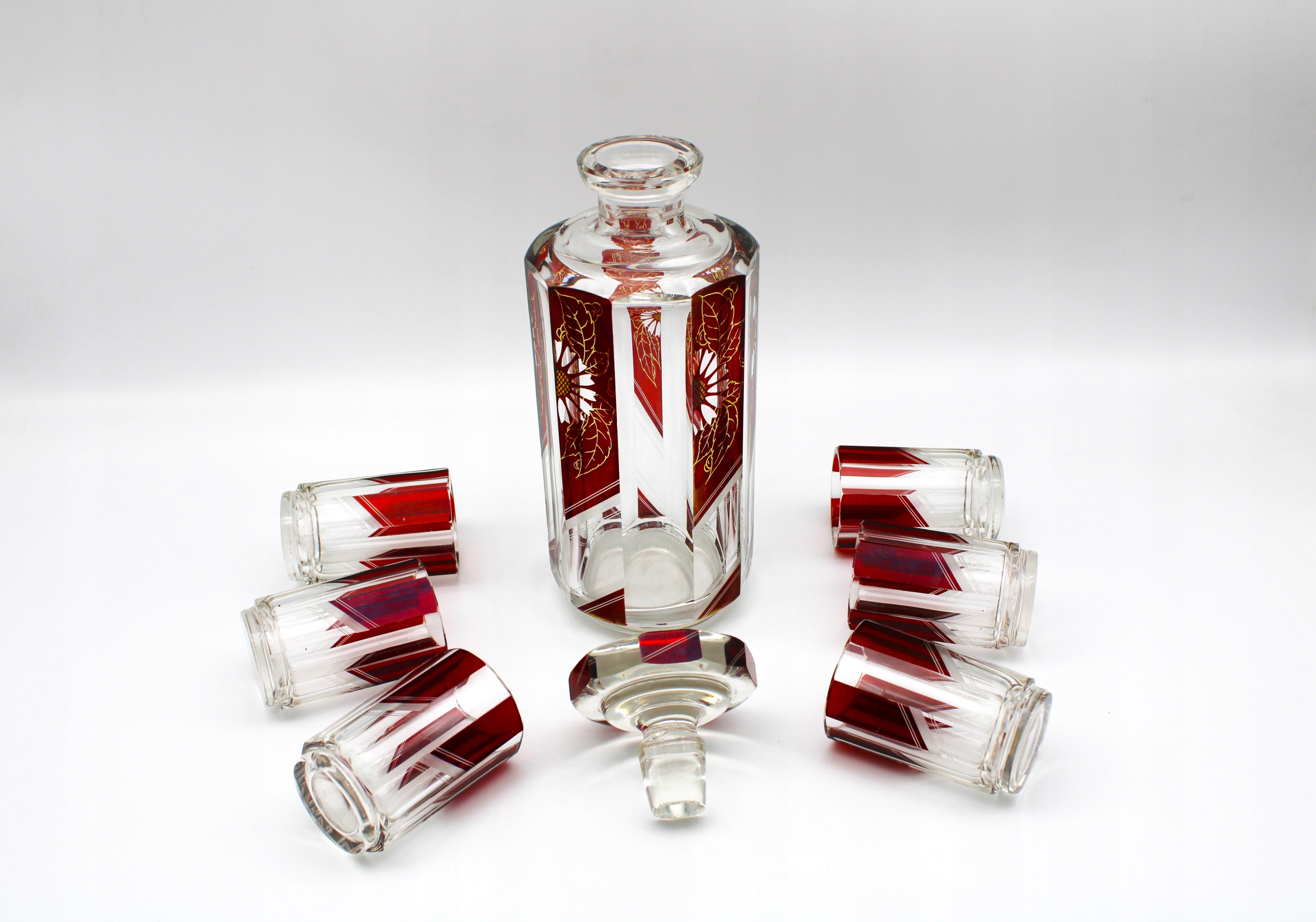 Я РЕКОМЕНДУЮ СТАРУ, ДУЖЕ ВАЖКУ, ВЕЛИКУ КРИСТАЛЕВУ КАРАФУ + 6 ВЕЛИКИХ КУЛЯНКІВ, УСІ ВРИЗАНІ ТА РУЧНУ ДЕКОРАЦІЮ, ДИЗАЙН KARL PALDA, СТАРА ЧЕХОСЛОВАЧЧИНА, СТАН, ЯК ПОКАЗАНО НА ДВОХ КУЛЯНАХ, ПРИРОДНІ ОЗНАКИ ВИКОРИСТАННЯ, НЕВЕЛИКІ ВКАЗІВКИ ЗНОШЕННЯ ТА НА КОРКОВОМУ КОНУСУ МАЛЕНЬКА ПЛОСКА ПОСІЛА ПОКАЗАНА НА ФОТО