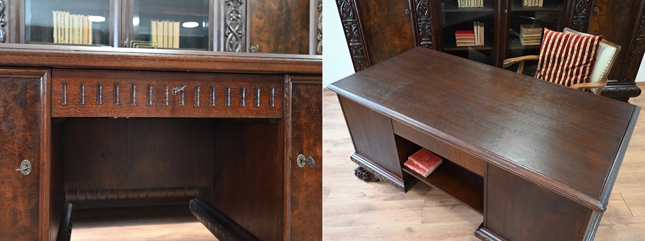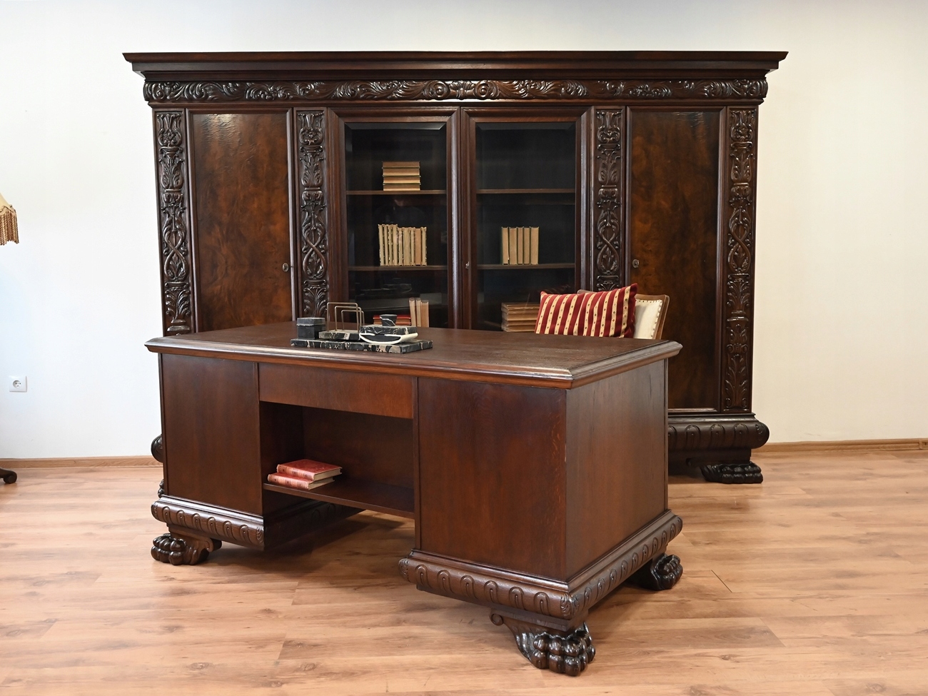 Вражаючий набір офісних меблів. Велика чотиридверна бібліотека з великими скошеними вікнами. Окремо стоячий стіл із полицею ззаду.