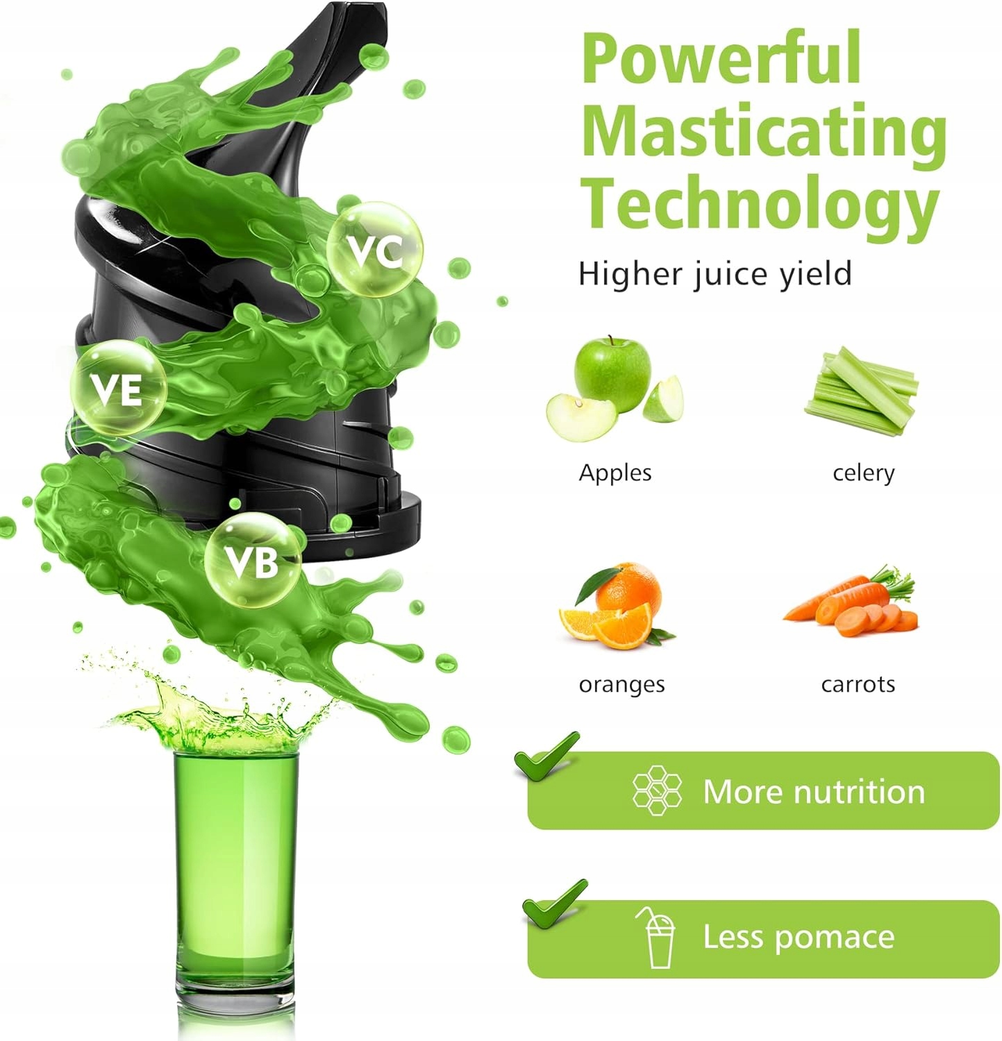 Ефективне вилучення з потужністю 200 Вт. Sokowirówka Aobosi SJ-022 використовує технологію холодного преси та високоякісного двигуна постійного струму з 200 W міддю, яка підтримує спіраль під час подрібнення та стискання за багато кроків, завдяки завдяки який сік витягується з кожною клітинами, максимально використовує продуктивність соку та зберігає свої первісні поживні речовини та збалансовану дієту для вас та вашої родини.