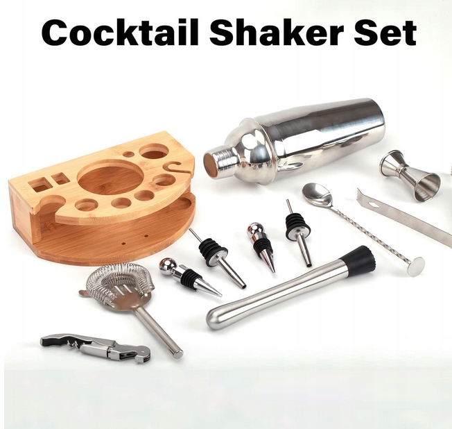- Назва предмета : набір шейкера для коктейлів, 12 елементів з нержавіючої сталі, набір барних аксесуарів, шейкер 750 мл для коктейлів, набір змішувачів для коктейлів, з дерев’яною основою для будинку або бару