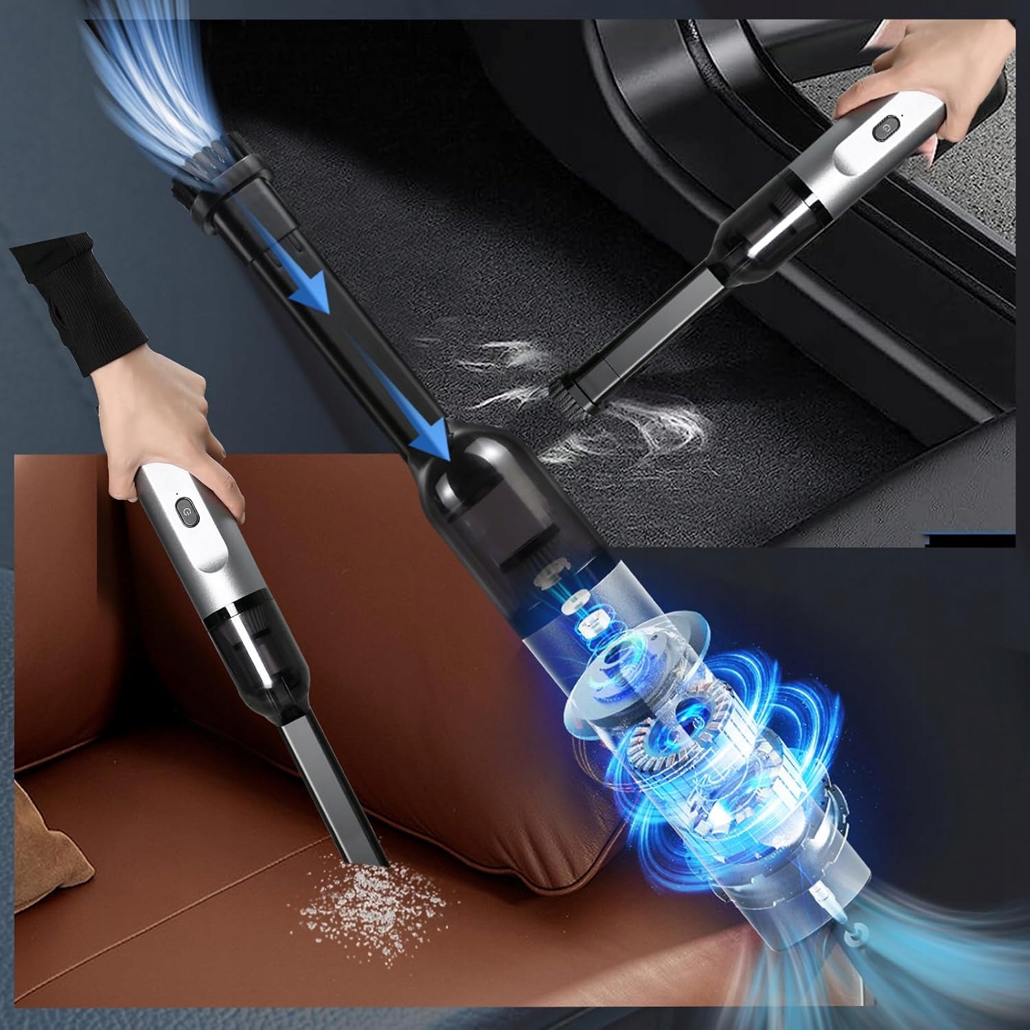Цей покращений міні-акумуляторний пилосос забезпечує циклонне всмоктування з потужність всмоктування до 15 кПа, тобто в 2 рази більше середнього. Ручний пилосос потужністю 90 Вт ідеально підходить для видалення пилу, крихт і шерсті домашніх тварин з автомобілів, диванів, стін, сходів і важкодоступних місць.