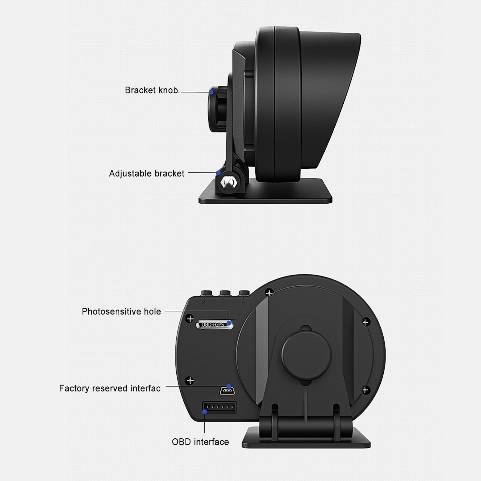 2. Світлодіодне освітлення: світлодіодне освітлення може змінити колір зі швидкістю автомобіля, синій означає нормальний, червоний миготливий сигнал сигналізації; Час може бути доданий у правому нижньому куті лічильника; Додано регульований базовий кронштейн, який можна регулювати, якщо це необхідно.