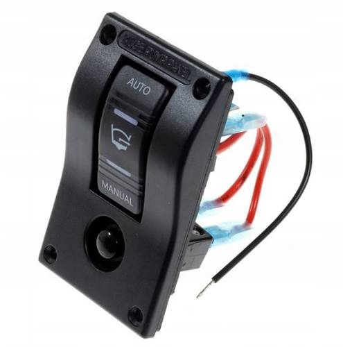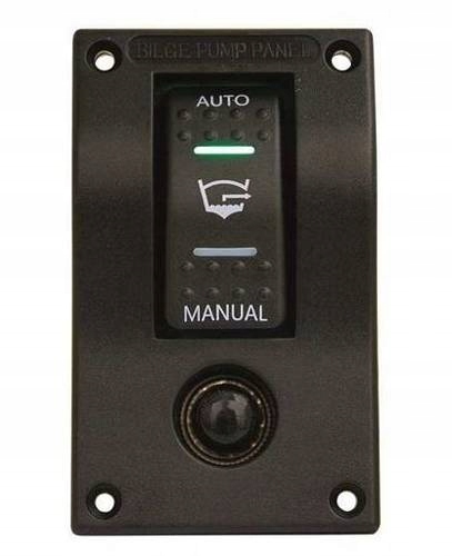 ПЕРЕМИКАЧ / ПЕРЕМИКАЧ ТРЮМНИХ НАСОСІВ - Універсальна панель управління трюмними насосами з автоматичним перемикачем (поплавковий або електронний). Дозволяє роботу в режимі ON-OFF-(ON): автоматичний, відключений або ручний (примусове повернення у вимкнене положення - захист). Має зелене світлодіодне підсвічування (автоматичний режим) і червоне (ручний режим). На панелі є розетка з автоматичним термобіметалічним запобіжником. Виготовлений з високоякісного міцного матеріалу чорного кольору.