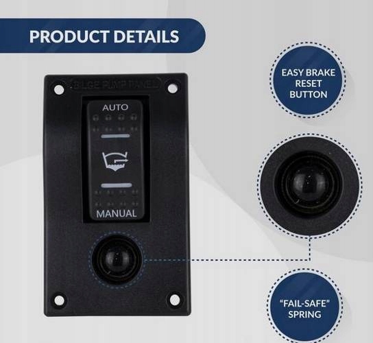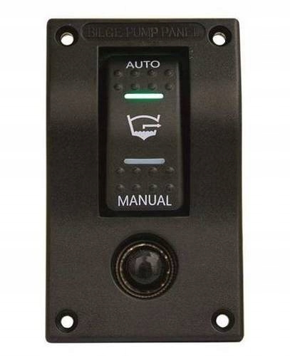 ПЕРЕМИКАЧ / ПЕРЕМИКАЧ ТРЮМНИХ НАСОСІВ - Універсальна панель управління трюмними насосами з автоматичним перемикачем (поплавковий або електронний). Дозволяє роботу в режимі ON-OFF-(ON): автоматичний, відключений або ручний (примусове повернення у вимкнене положення - захист). Має зелене світлодіодне підсвічування (автоматичний режим) і червоне (ручний режим). На панелі є розетка з автоматичним термобіметалічним запобіжником. Виготовлений з високоякісного міцного матеріалу чорного кольору.