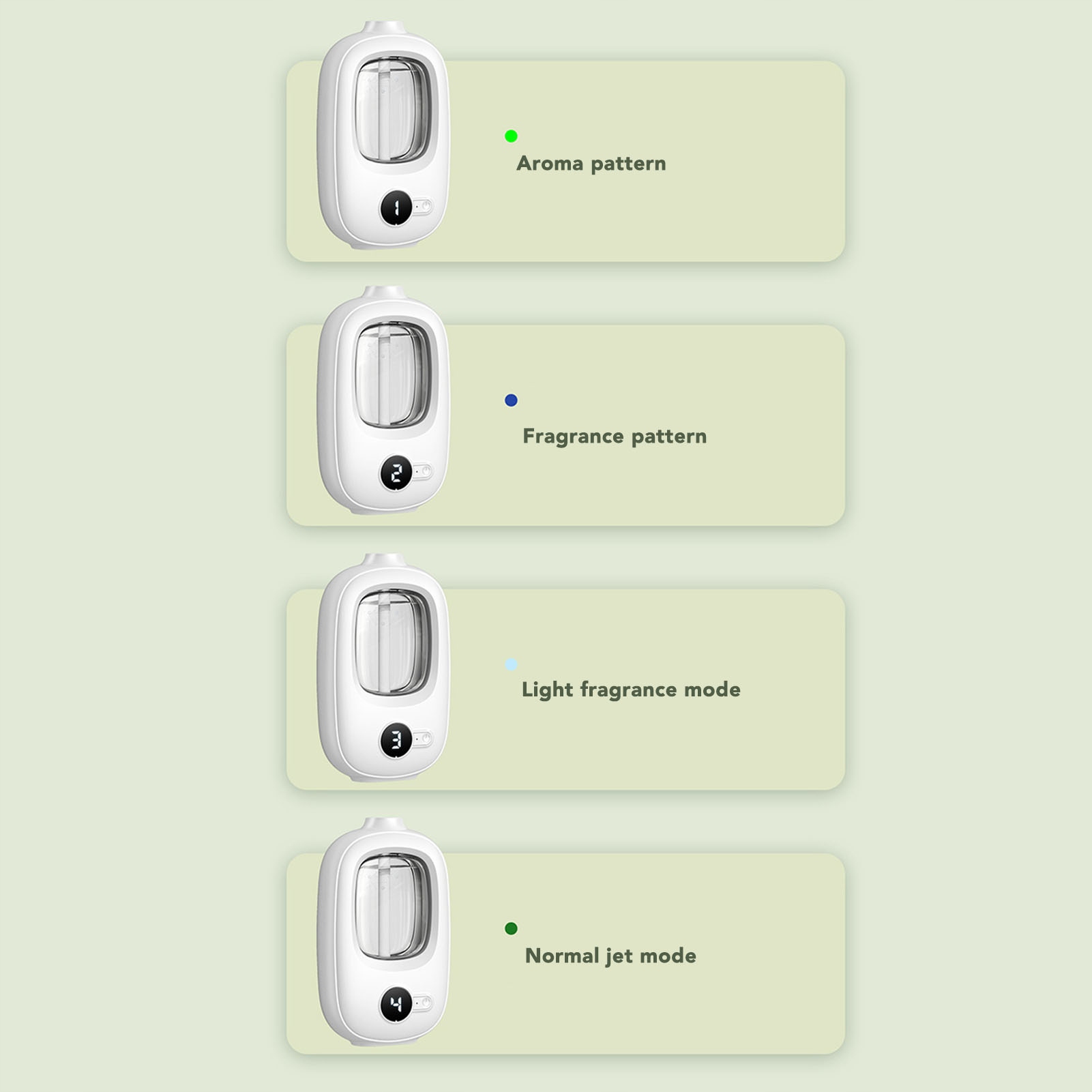 2. 4 режими туману: завдяки 4 цифровим дисплеям ви можете легко налаштувати аромат на свій смак. Відрегулюйте інтенсивність аромату та встановіть його на автоматичне розпилення через регулярні проміжки часу для персоналізованого досвіду ароматерапії.