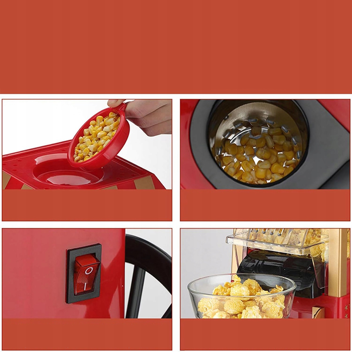 Пані та панове, цією електричною машиною для приготування попкорну неймовірно легко користуватися! Просто насипте ложку кукурудзяного зерна в годівницю, натисніть кнопку і ви отримаєте попкорн з ефективністю понад 99%. Примітка. Вибирайте кукурудзяні зерна, спеціально призначені для попкорну (бажано з вмістом вологи 13%-14,5%).