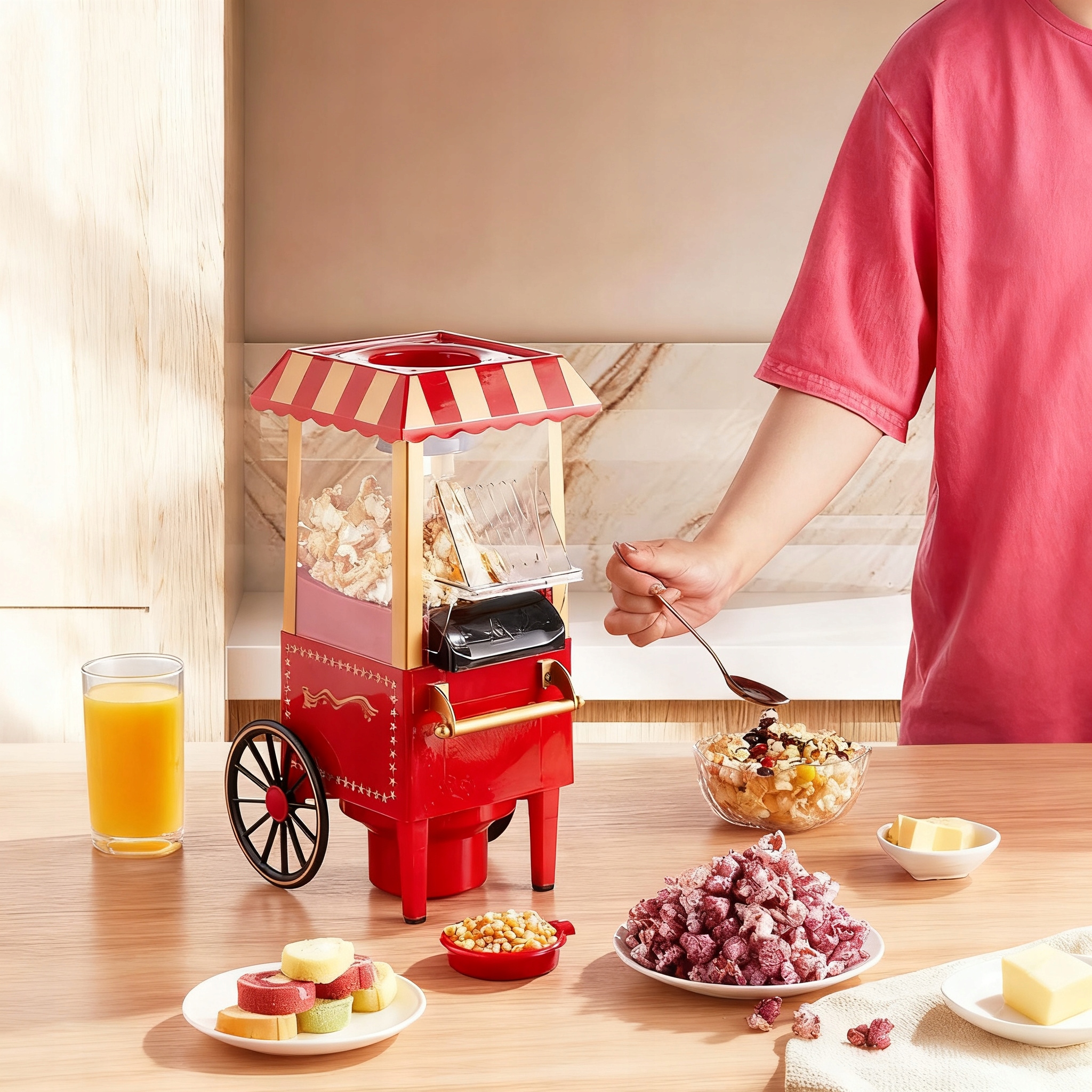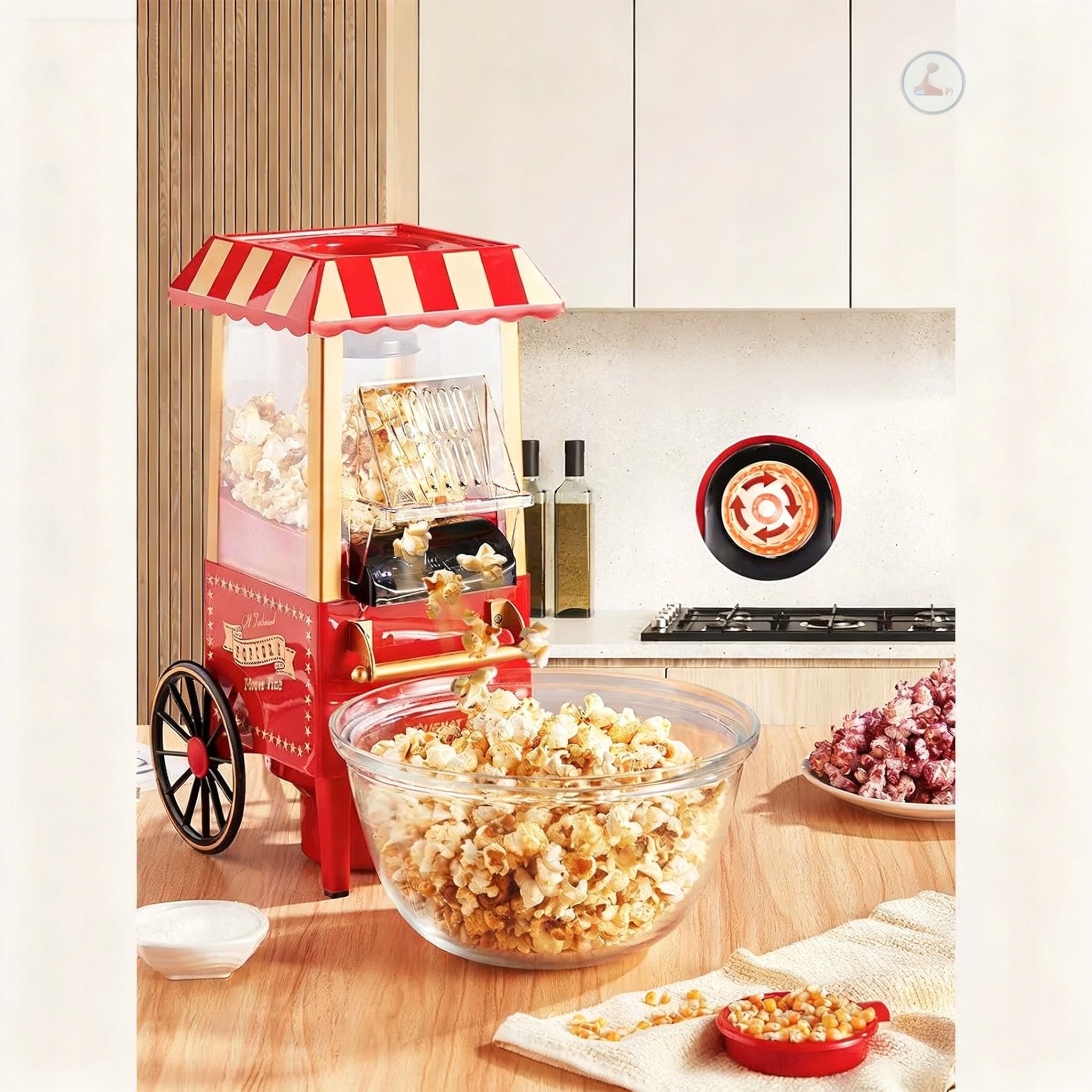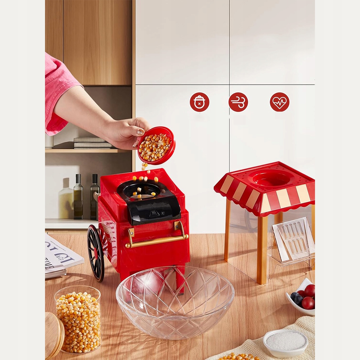 Любі, дивіться сюди! Ця вдосконалена машина для попкорну в стилі ретро чарівно прикрасить вашу вітальню та кухню. Покращена циркуляція гарячого повітря забезпечить вам ще більше свіжого та смачного попкорну!