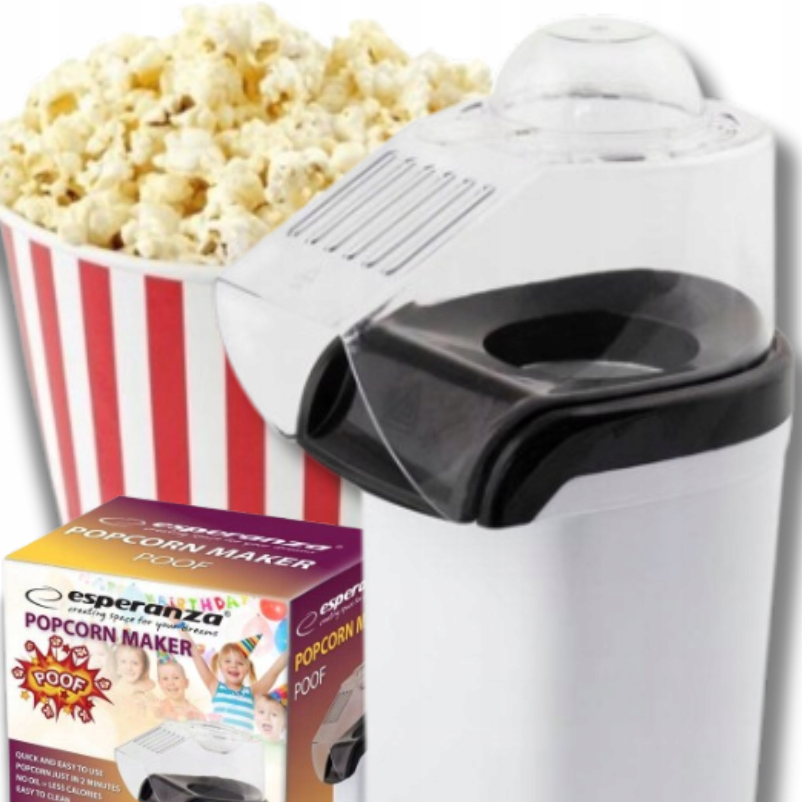З нашою машиною для виготовлення попкорну Esperanza POOF ви можете приготувати здорову та смачну закуску за 2–3 хвилини. Завдяки циркуляції гарячого повітря попкорн приготується здоровим способом, без використання олії - повністю БЕЗ ЖИРУ. Тепер ви та вся ваша родина можете насолоджуватися смаком попкорну, як у кінотеатрі.