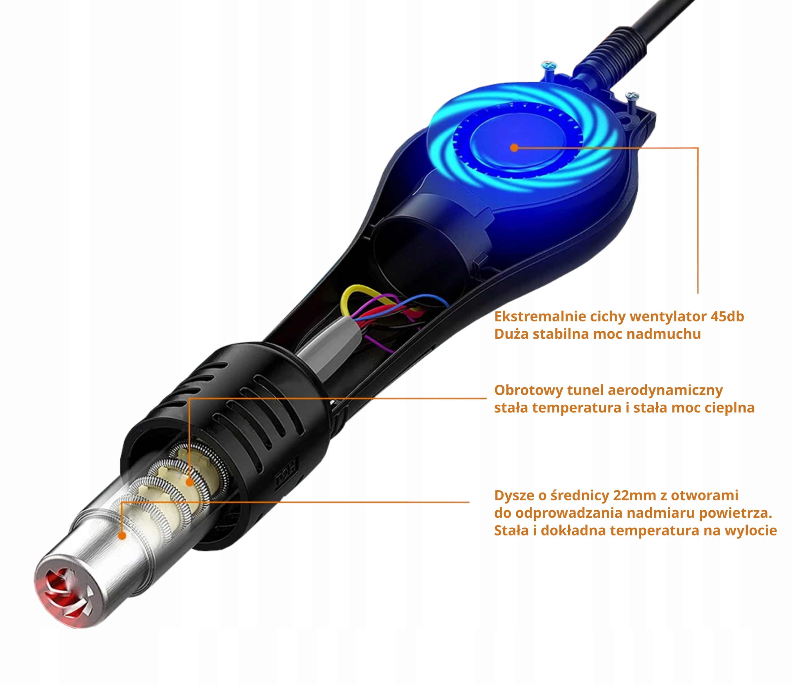 - Потужний потік гарячого повітря: оснащено міцним безщітковим вентилятором, який створює сильний потік гарячого повітря повітря.