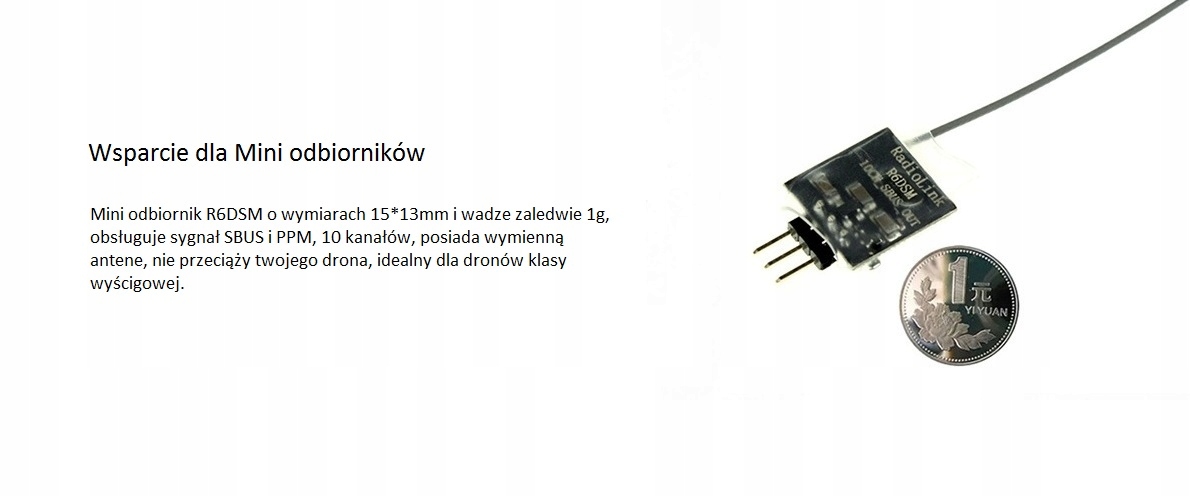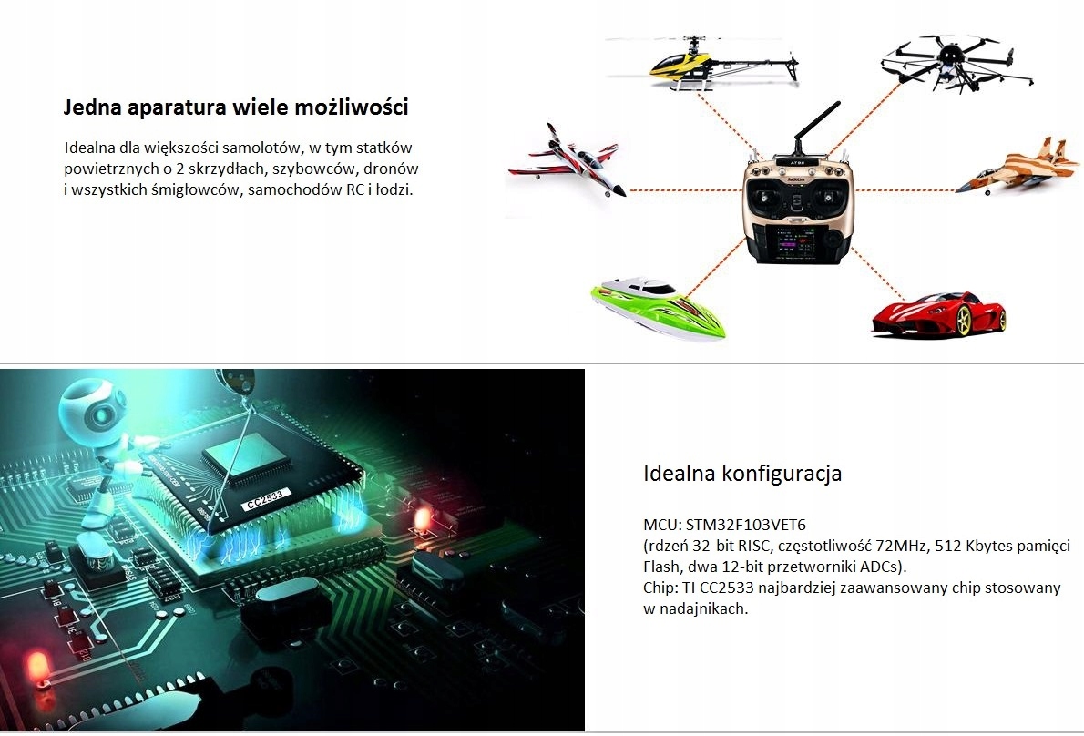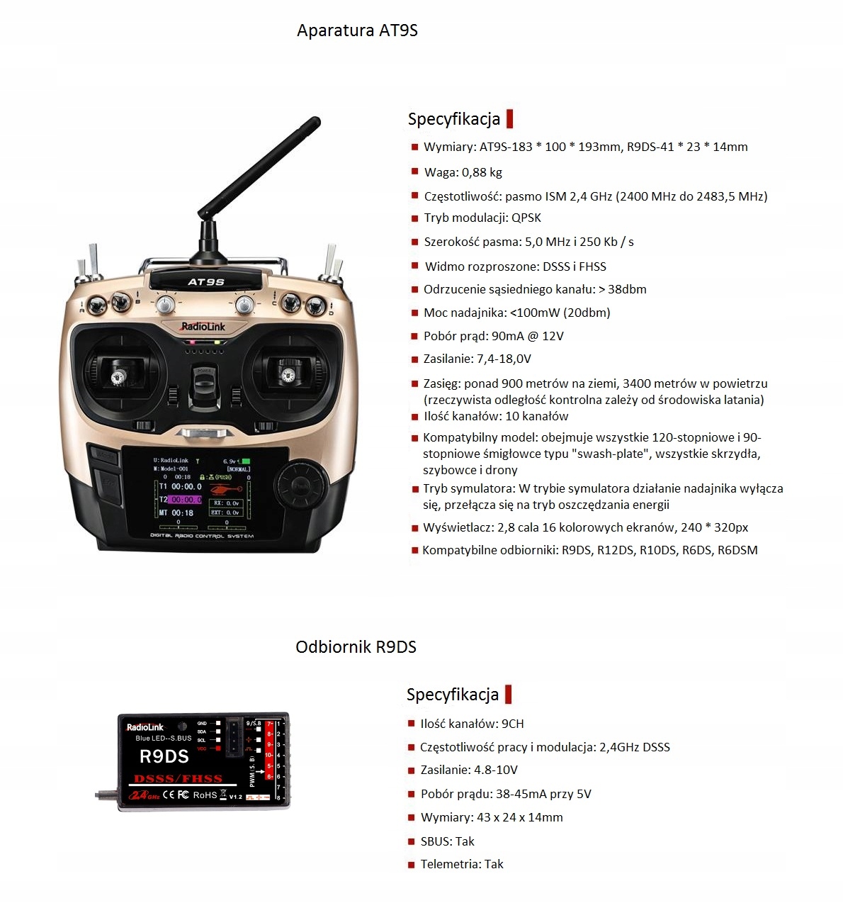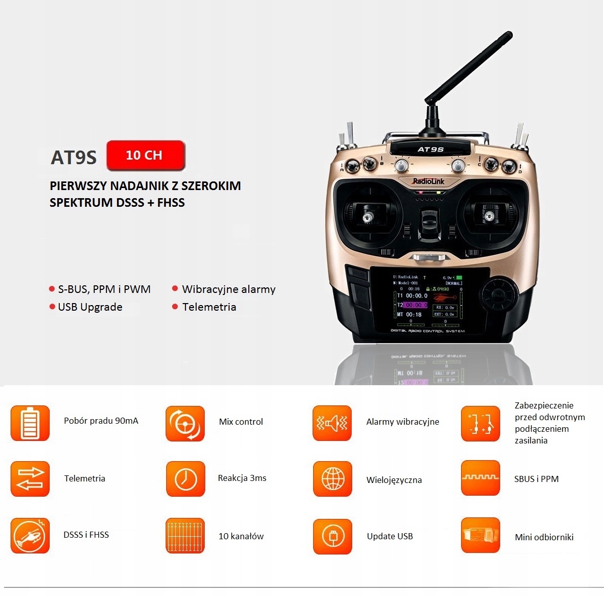 Остання версія пристрою RadioLink AT9S — це універсальна радіостанція, яка ідеально підходить для початківців і просунутих моделістів, для керування дистанційно керованими моделями планерів, дронів, гелікоптерів, човнів і літаків з двигуном згоряння та електроприводом. Устаткування включає змішувач V-Tail і Elevon. Крім того, пристрій має функцію телеметричного відображення, завдяки якій за допомогою додаткових датчиків, наприклад PRM-01, він дозволить дистанційно контролювати напругу блоку живлення двигуна або контролювати силу сигналу RSSI. Обладнання легко програмувати, інтуїтивно зрозуміле у використанні та багате оснащення. Великий кольоровий РК-дисплей дозволить легко і швидко налаштувати всі необхідні параметри для даної моделі. Передача даних на частоті 2,4 ГГц і модуляції DSSS забезпечує максимальну безпеку використання та відсутність перешкод під час роботи.