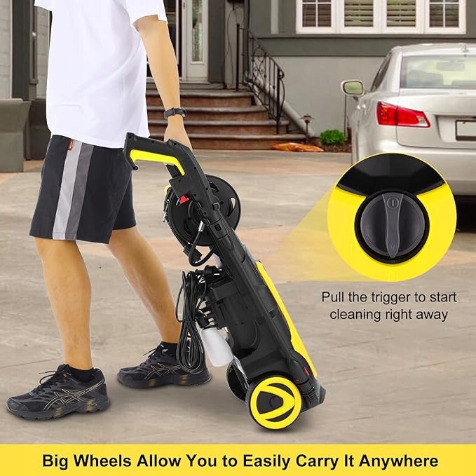 - Високий тиск: потужний двигун потужністю 1900 Вт створює тиск до 150 бар. Ідеально підходить для чищення доріжок, палуб, цементу, бруківки, басейнів, вуличних меблів, автомобілів, вантажівок, фургонів, квадроциклів тощо.