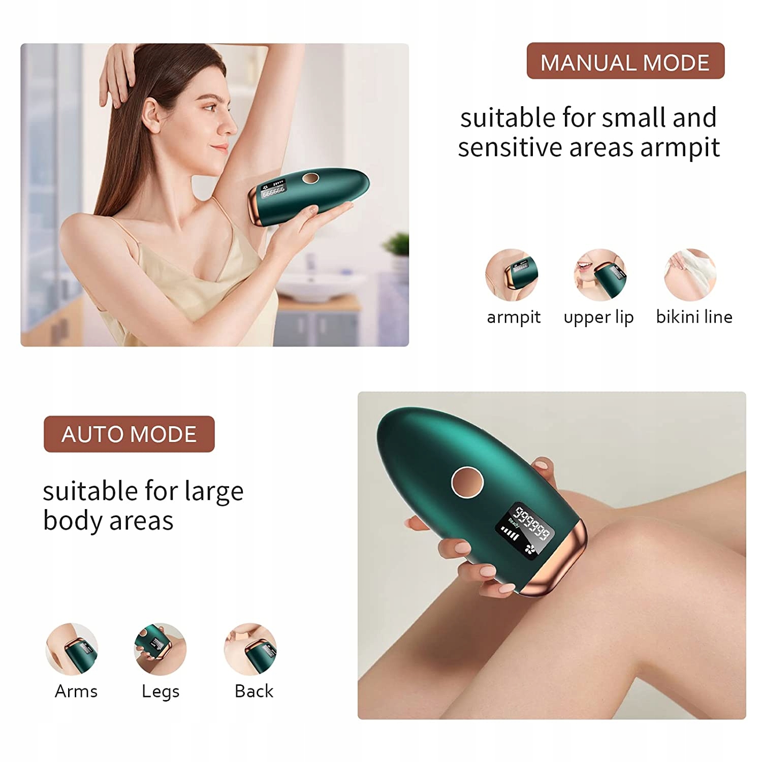 - 5 рівнів енергії та 2 режими спалаху: пристрій для видалення волосся IPL має 5 різних рівнів енергії для адаптації до різної чутливості шкіри. Ручний режим в основному використовується для видалення волосся на невеликих ділянках, таких як зона бікіні, передпліччя, пальці та губи. Автоматичний режим можна використовувати для видалення великих ділянок волосся, таких як руки, ноги, живіт і спина. (*Примітка: не підходить для темної шкіри)
