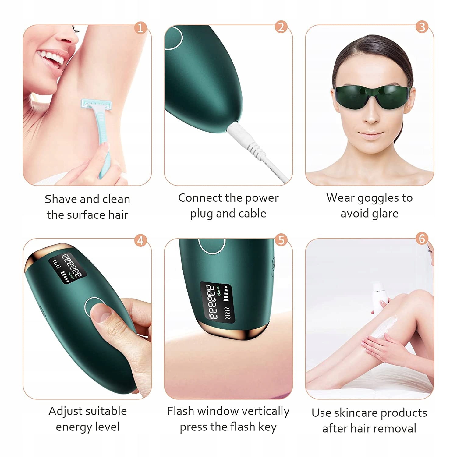 - [100% безпечний і 999 999 спалахів] Після випробувань безпеки та клінічних випробувань світло, випромінюване IPL-епіляцією, на 100% безпечне для людського тіла. Кількість спалахів 999 999 достатньо, щоб зняти все тіло 9-11 людей. Дотримуйтеся правильних інструкцій з IPL-епіляції та обробляйте обличчя та тіло приблизно 30 хвилин на день, щоб шкіра стала красивішою та гладкішою.