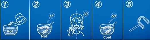 Після нагрівання матеріалу в гарячій воді (приблизно 70 градусів) термопластичний пристрій стає м’яким, завдяки чому при розміщенні в роті , можна формувати нижню та верхню щелепу. Потримайте кришку у воді приблизно 15-25 секунд, а потім зніміть її за ручку. Після формування та охолодження брекет готовий до використання під час сну.