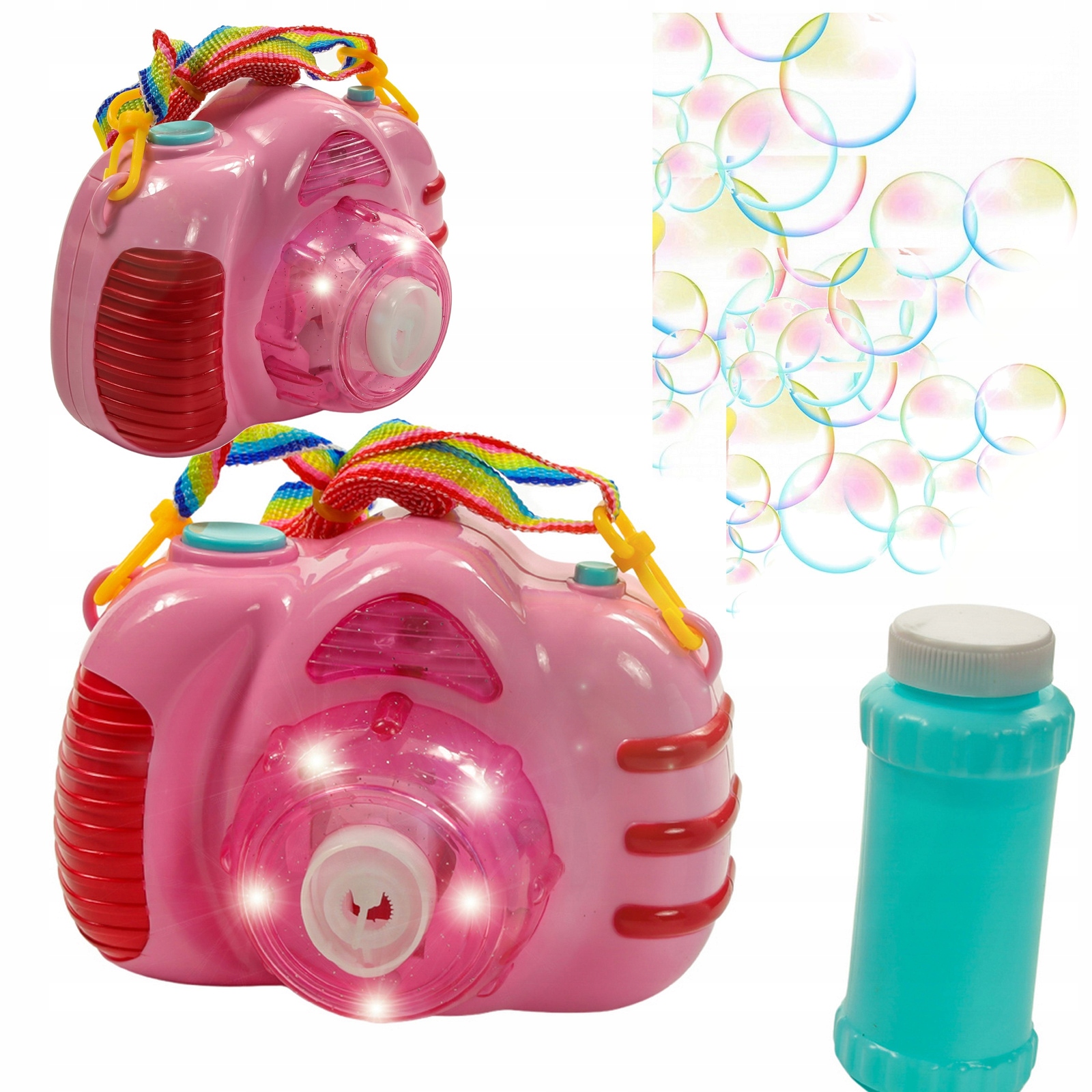 Фотоапарат, схожий на фотографічний, ідеально підійде для цієї ролі. Замість фотографій він робить багато різнокольорових мильних бульбашок! Просто налийте рідину, натисніть кнопку і камера спалахне, заграє мелодії, а з «лінзи» полетять різнокольорові бульбашки.