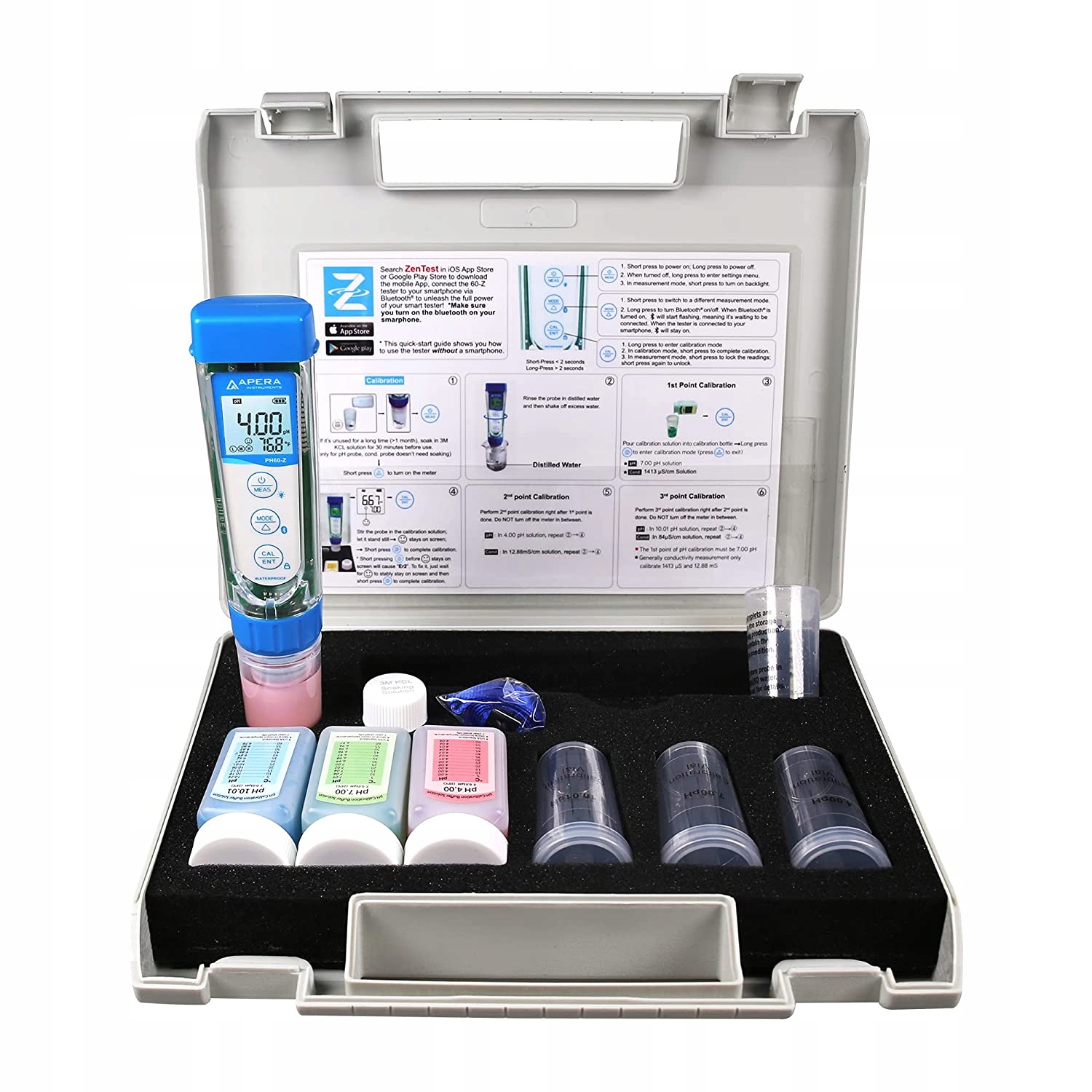Все це в портативній валізі: тестер pH60-Z, калібрувальні розчини ((pH 7.00, pH 4.00), калібрувальні пляшки, розчин для зберігання, повідок, 4 батареї AAA (встановлені) та скорочені посібник.