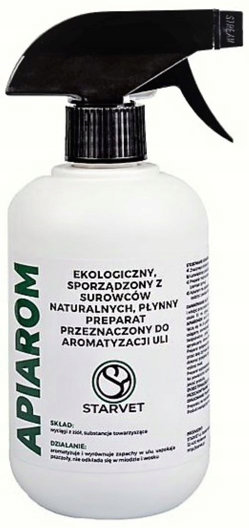 Дозування: за 15-30 хвилин до приєднання до рою просочіть ганчірку Апіаром і помістіть її через вихідний отвір на дні вулика (марлева ганчірка має розміри 10х10 см і вбирає приблизно 10 мл рідина). Потім колонію, яка у нас є, обприскуємо Апіаром і через 5-10 хвилин виливаємо на платформу. Бджоли заходять у вулик і спаровуються. Через 24 години тканину викиньте з вулика через випускний отвір. Завдяки цій діяльності ми досягаємо дезінфекції, ароматизації та вирівнювання запахів у вулику. Висячий рій обприскуємо безпосередньо перед з’єднанням із сім’єю. Перед оглядом ми збризкуємо руки Apiarom для дезінфекції та захисту від укусів. Препарат замінює дим. При огляді вуликів ми можемо обприскувати рамки зверху - так бджоли заспокоюються і спускаються вниз, і ми легко можемо їх оглянути (наприклад, видалити маточники, змінити ширину входів і т. д.) або відібрати мед.