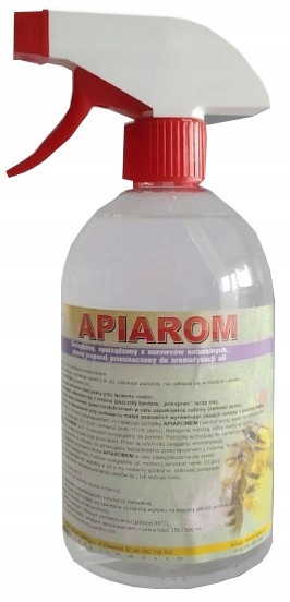 Дозування: за 15-30 хвилин до приєднання до рою просочіть ганчірку Апіаром і помістіть її через вихідний отвір на дні вулика (марлева ганчірка має розміри 10х10 см і вбирає приблизно 10 мл рідина). Потім колонію, яка у нас є, обприскуємо Апіаром і через 5-10 хвилин виливаємо на платформу. Бджоли заходять у вулик і спаровуються. Через 24 години тканину викиньте з вулика через випускний отвір. Завдяки цій діяльності ми досягаємо дезінфекції, ароматизації та вирівнювання запахів у вулику. Висячий рій обприскуємо безпосередньо перед з’єднанням із сім’єю. Перед оглядом ми збризкуємо руки Apiarom для дезінфекції та захисту від укусів. Препарат замінює дим. При огляді вуликів ми можемо обприскувати рамки зверху - так бджоли заспокоюються і спускаються вниз, і ми легко можемо їх оглянути (наприклад, видалити маточники, змінити ширину входів і т. д.) або відібрати мед.