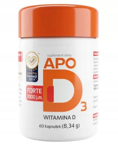 Вітамін D3, або «сонячний вітамін», надзвичайно важливий для правильного функціонування людського організму. Він виробляється в шкірі під впливом сонячних променів. У Польщі ж це можливо лише в період з квітня по вересень – у другій половині дня. Тому так важливо в інші пори року надходити вітамін D3 ззовні. Вітамін D3 підтримує роботу імунної системи. Він благотворно впливає на правильну роботу м'язів, а також, як ми всі знаємо, необхідний для правильної будови кісток і зубів. У правильній концентрації він робить кістки міцними, а зуби здоровими. Належний рівень вітаміну D3 також означає добре функціонуючу систему кровообігу, струнку фігуру та знижений ризик розвитку раку. ApoD3 Forte 2000 МО - це рекомендована, безпечна та ефективна кількість вітаміну D3 в одній капсулі!
