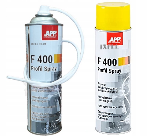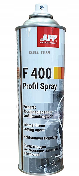 APP F400 Profil Spray - стійко еластичний гідрофобний препарат на основі мінерального масла, парафіну та просочення для антикорозійного захисту закритих профілів і важкодоступних місць кузова автомобіля, таких як: кузов і дверні балки, моторні відсіки та багажник.