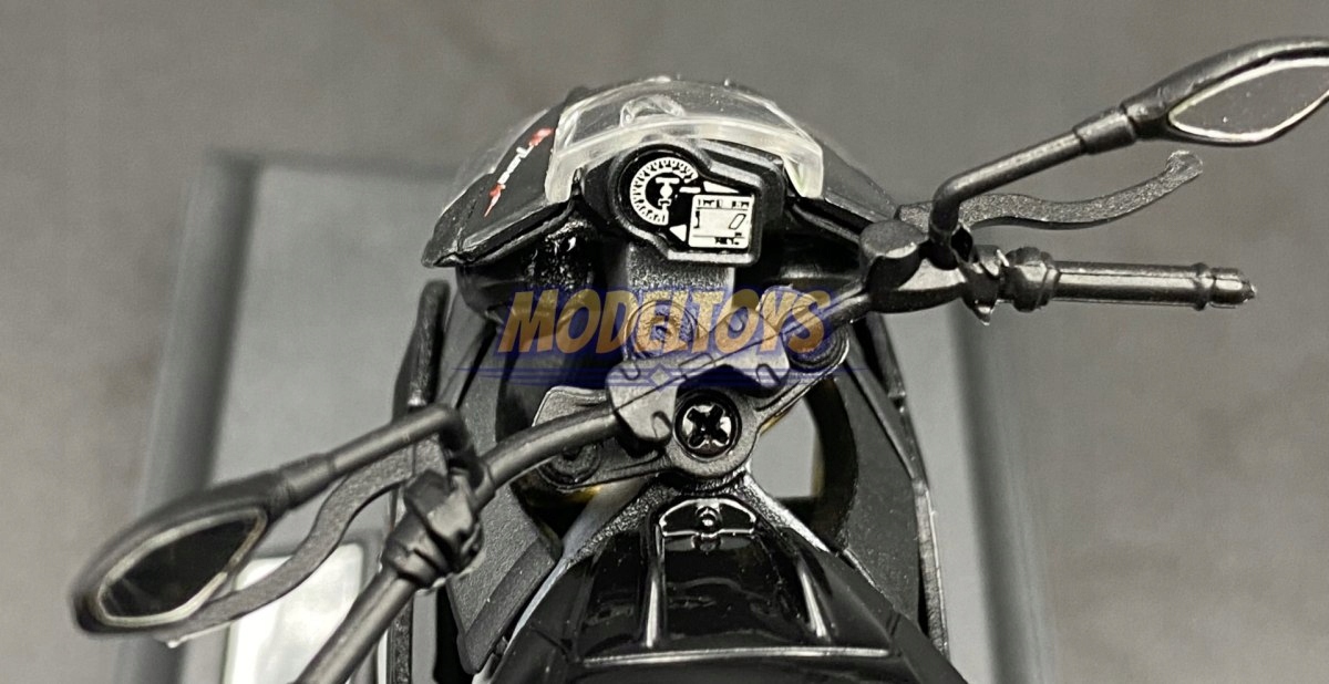 Модель мотоцикла, зроблена з увагою до деталей. Він має рухомі елементи: колеса, кермо, задня розмаху та бічна підставка.
