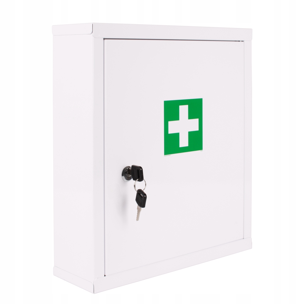 Настінна аптечка підходить для використання як в адміністративних, так і в промислових приміщеннях. Матеріал аптечки - листовий оцинкований метал, покритий високоякісним поліуретановим лаком.