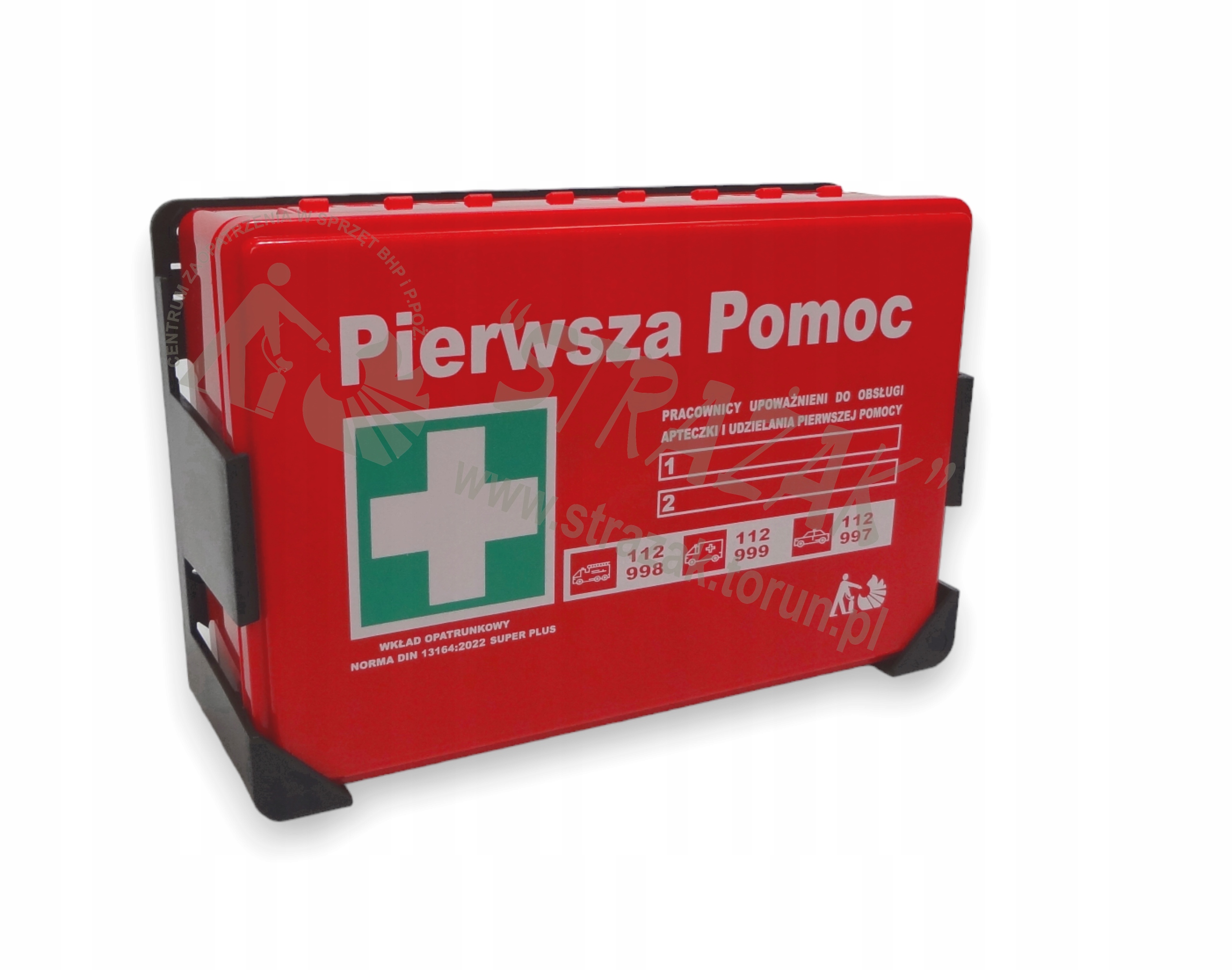 Аптечка - червона з обладнанням DIN 13164 SUPER PLUS з мундштуком. Призначено для: компаній, промислових підприємств, шкіл, дитячих садків, громадських установ. Виготовлена з високоякісного матеріалу. Має ручку, що дозволяє повісити на стіну. Продукт відповідає вимогам стандартів Європейського Союзу.