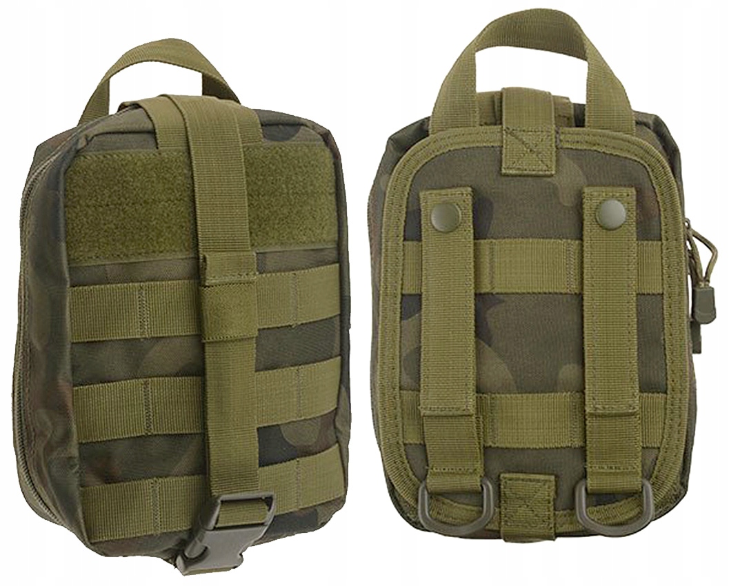 Набір першої допомоги може бути встановлений за допомогою панелі липучок до обладнання відповідно до системи молле або безпосередньо до системи липучки. Комплект першої допомоги додатково увійшов до стрічки з пряжкою, яка також допоможе стиснути вміст вантажу.