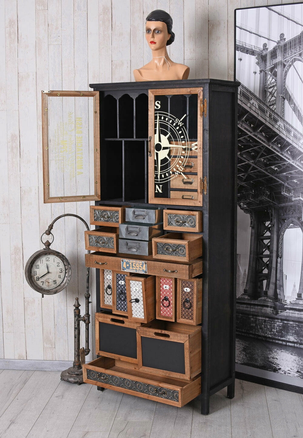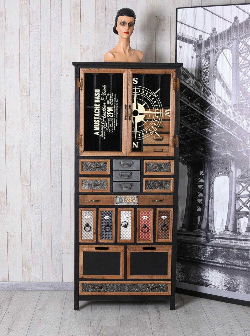 Високий гардероб, стилізований як аптека. Він має численні ящики в різних розмірах та ширині. У кожного з них також є інші декоративні елементи, застосовані до зовнішніх частин. Завдяки цьому, шафа Apleta Loft виглядає більш привабливо, він барвистий з друкованими різними візерунками.
