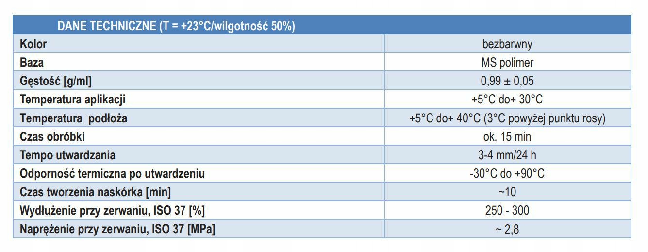 Високеластичний клей-герметик на основі MS Polymer. Дуже високе початкове зчеплення і кінцева міцність з'єднань. Висока гнучкість і чудова адгезія до будівельних поверхонь: метал, цегла, бетон, дерево, мідь, скло. Навіть на вологій поверхні. Дуже висока міцність і стійкість. Стійкий до зміни погодних умов. З'єднання міцне і дуже гнучке. Піддається фарбуванню. Без запаху.