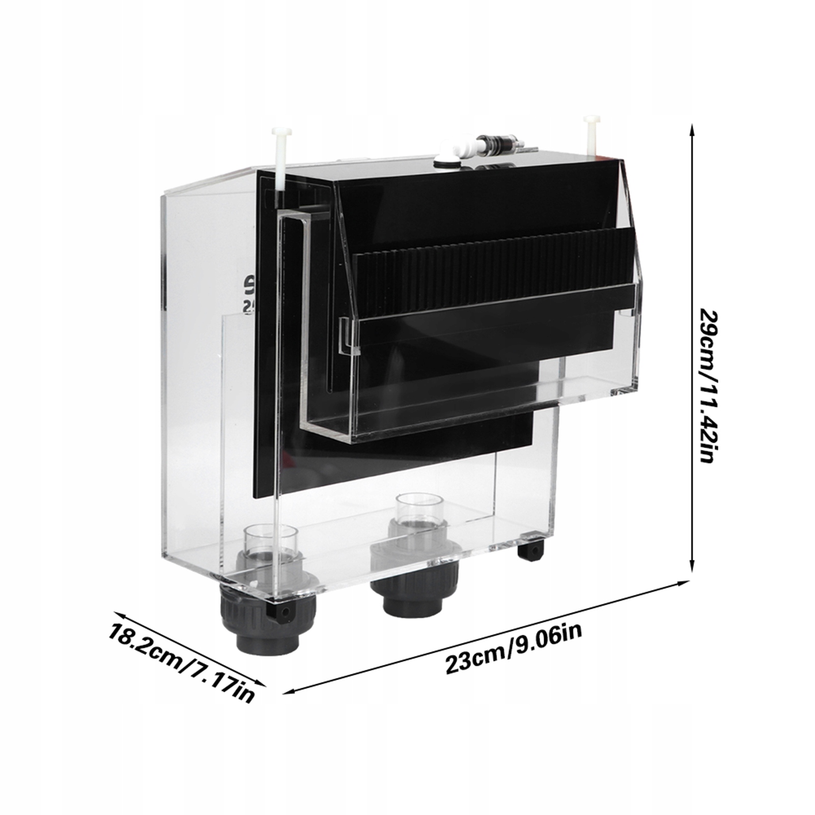Введення продукту: Коробка переповнення прикріплена до краю акваріума і підключена до системи фільтрів у нижній частині акваріума. Після запуску переповненої коробки вода в акваріумі може бути закачана в акваріум через експлуатацію циркуляційного насоса, а потім пропливати через коробку затоку до криниці, завдяки якому процес циркуляції в акваріумі можна легко реалізувати, не перевертаючи отвір у нижній частині акваріума.
